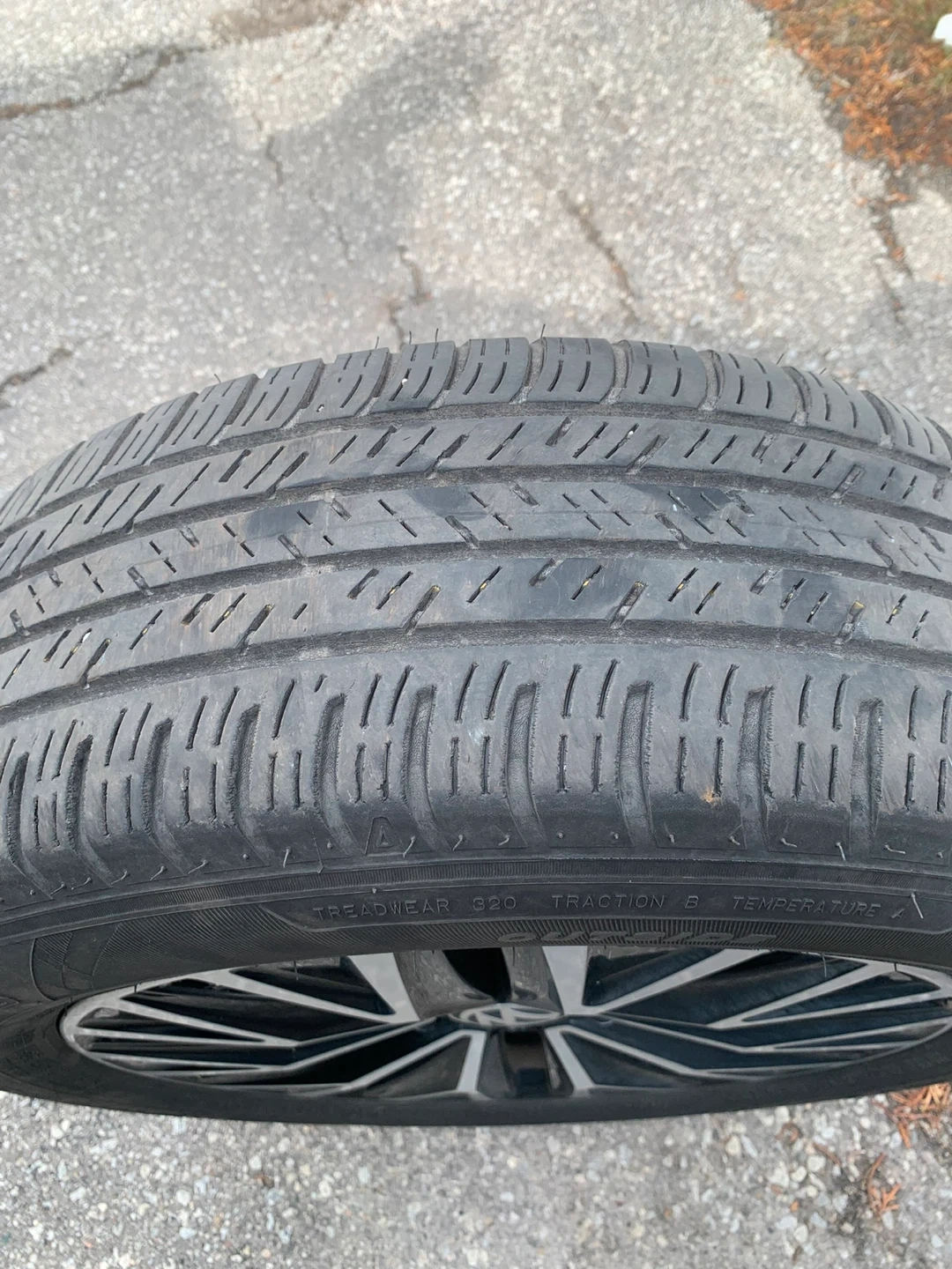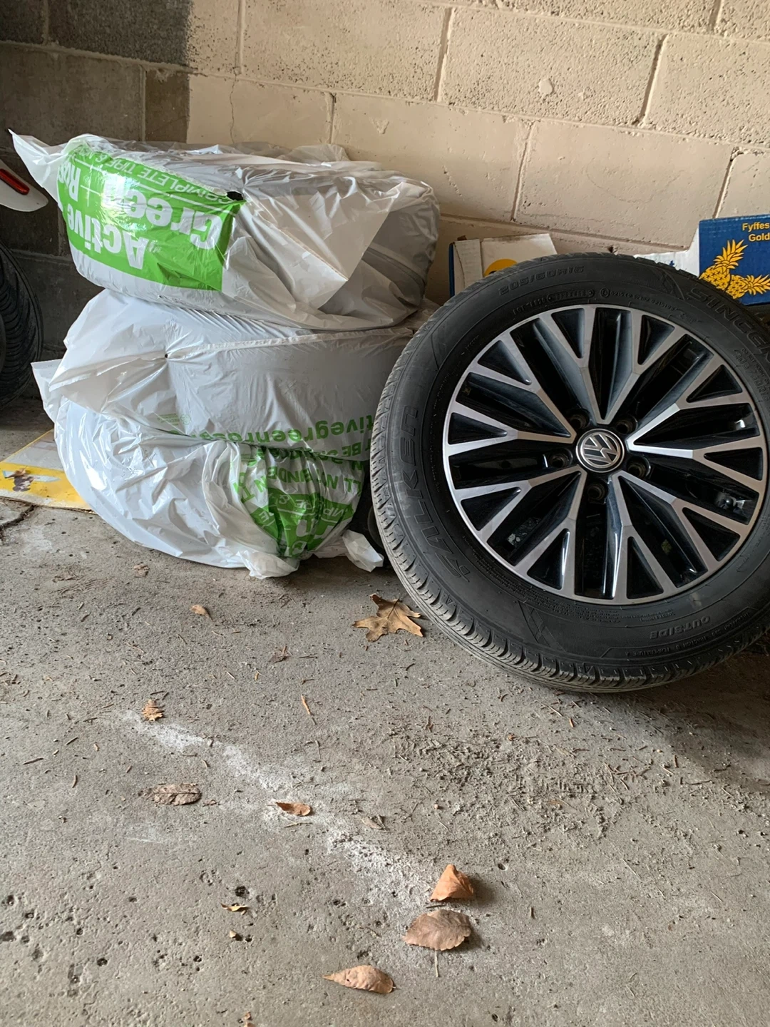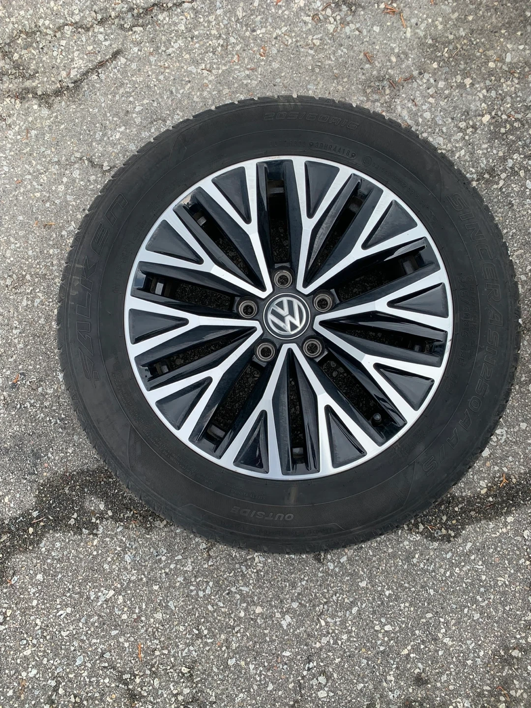 Set of four Volkswagen alloy wheels with tires. They're 17-inch wheels with a multi-spoke design. The tires are Goodyear Assurance 225/50R17.
