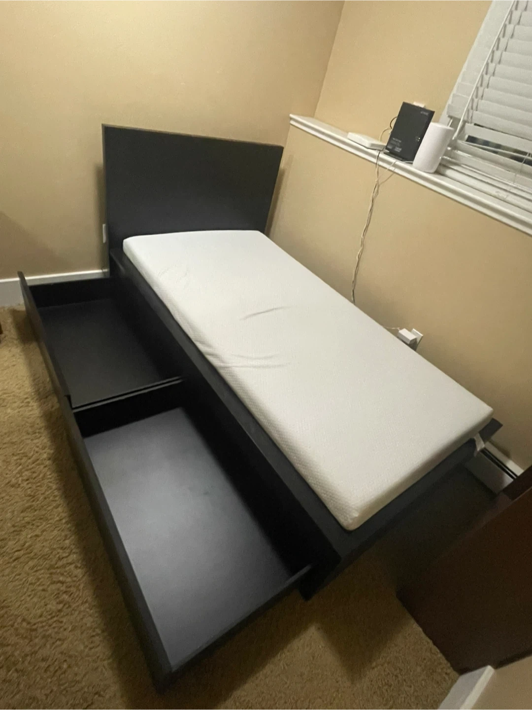 This black twin bed frame features two large storage drawers underneath. It's perfect for maximizing space in smaller rooms. The slatted bed base provides good mattress support.