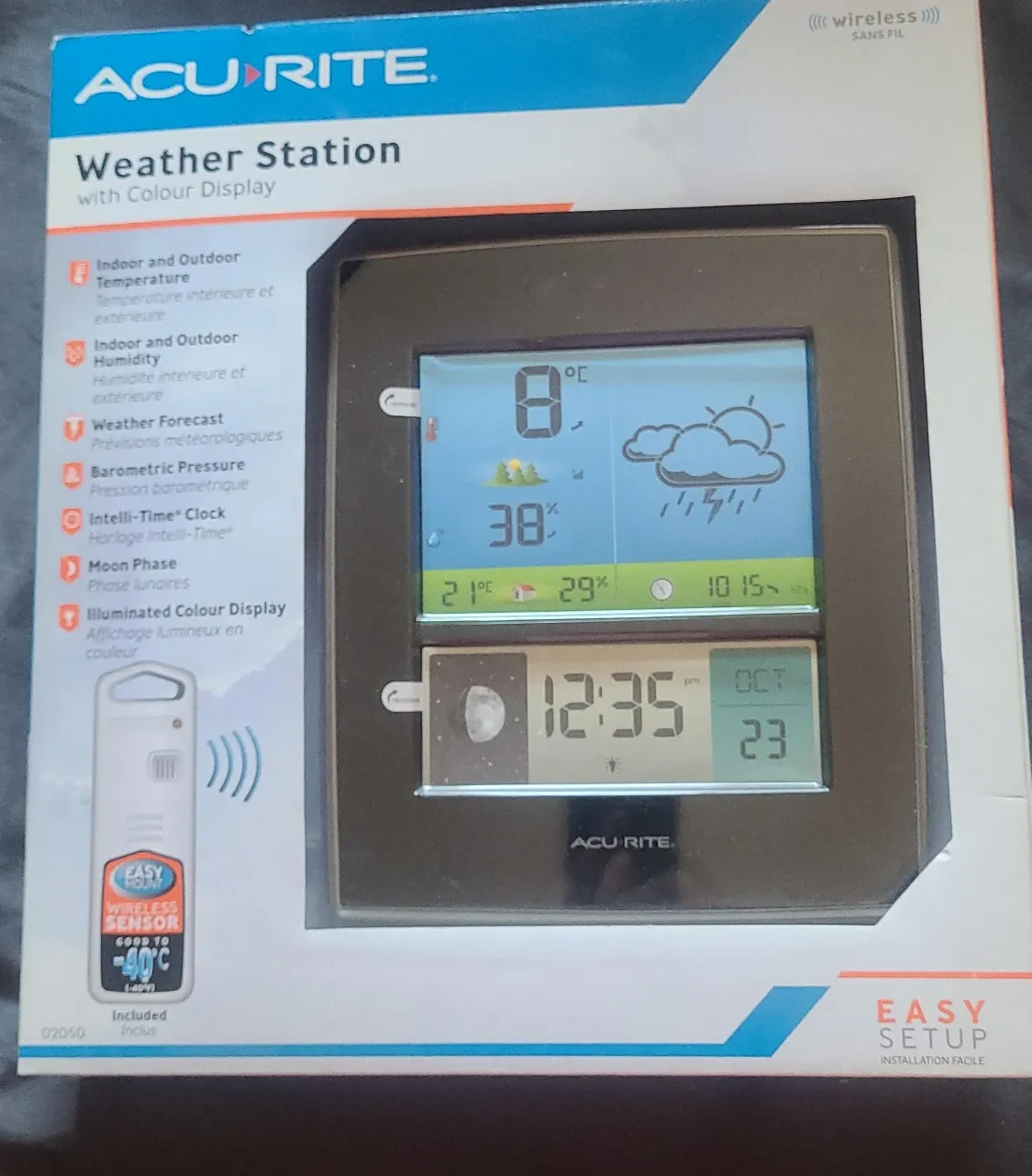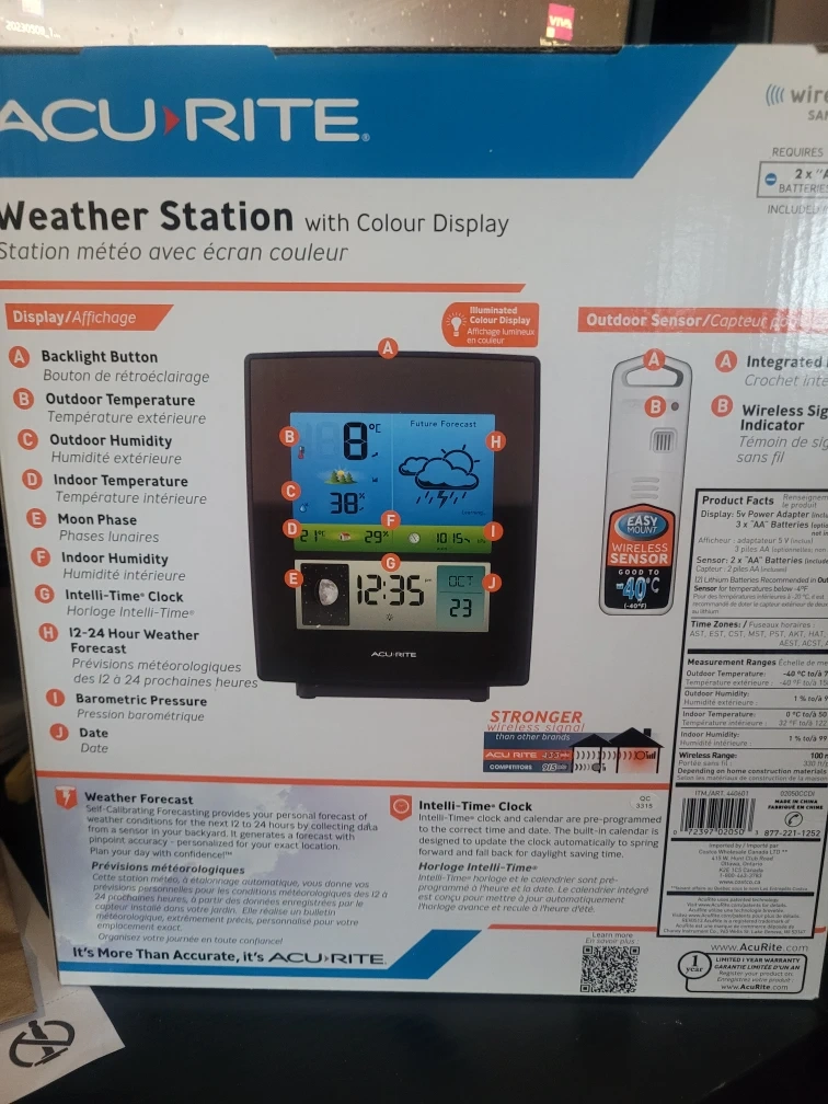 Selling a brand new AcuRite Weather Station with Colour Display! Never opened, intact manufacturer seal. This station provides indoor and outdoor temperature and humidity readings, along with weather forecasts and barometric pressure. It also features an Intelli-Time clock and moon phase display. The included wireless sensor has an easy mount and is good to -40°C. It comes in its original box for easy setup!