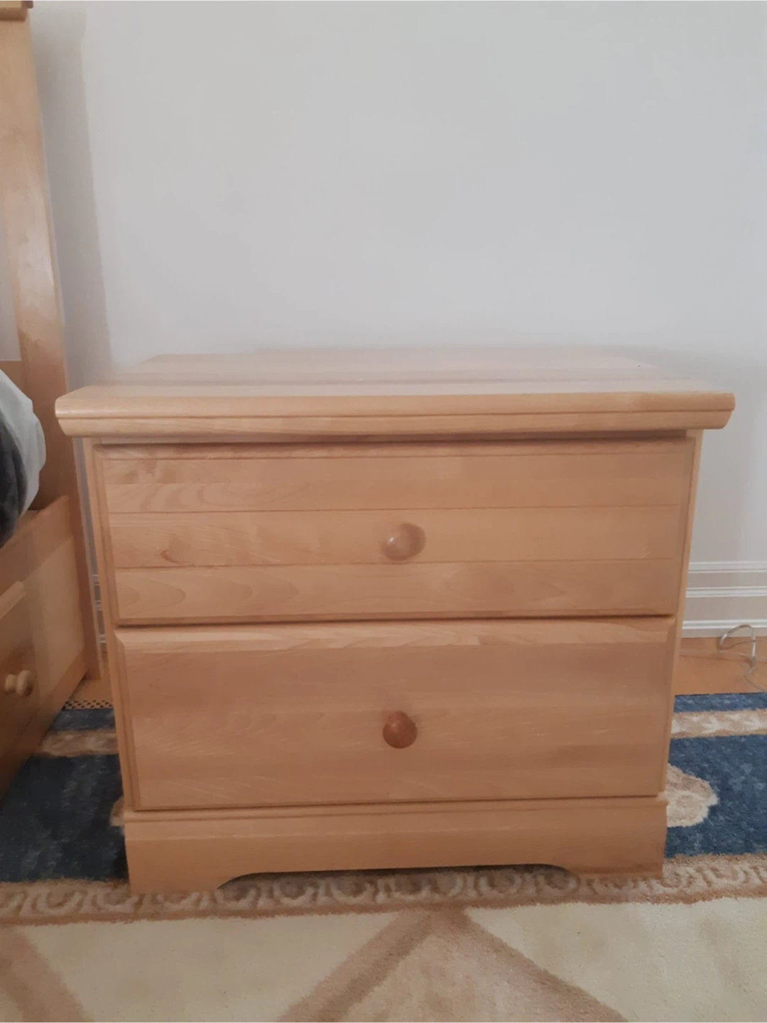 Twin bed and matching nightstand in a gorgeous oak colour. Made of solid wood, very sturdy. Bed and nightstand each have two drawers. In great condition.