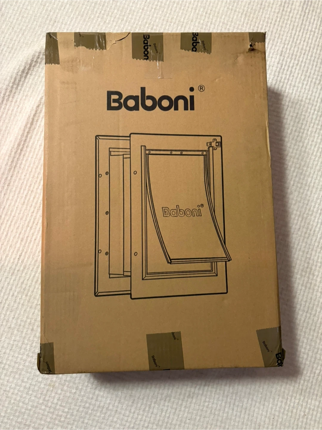 This is a Baboni pet door, size large with a 2-flap design. It's made for keeping pets in or out. Useful for homes with pets needing quick access.