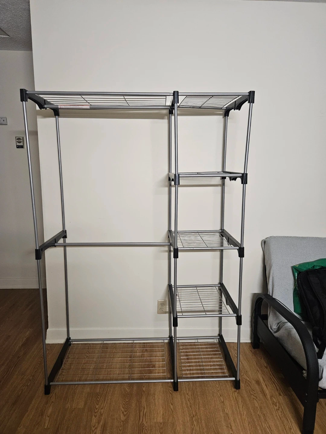 This metal garment rack offers ample hanging space and multiple shelves for storage. It features a durable metal construction and a practical design. It's great for organizing clothes and accessories in a closet or room.