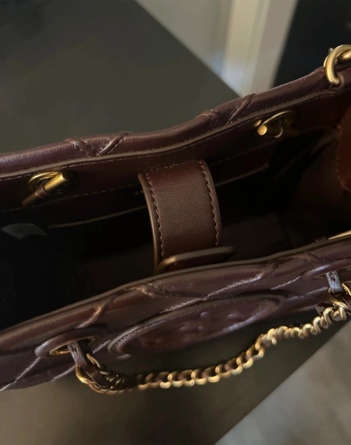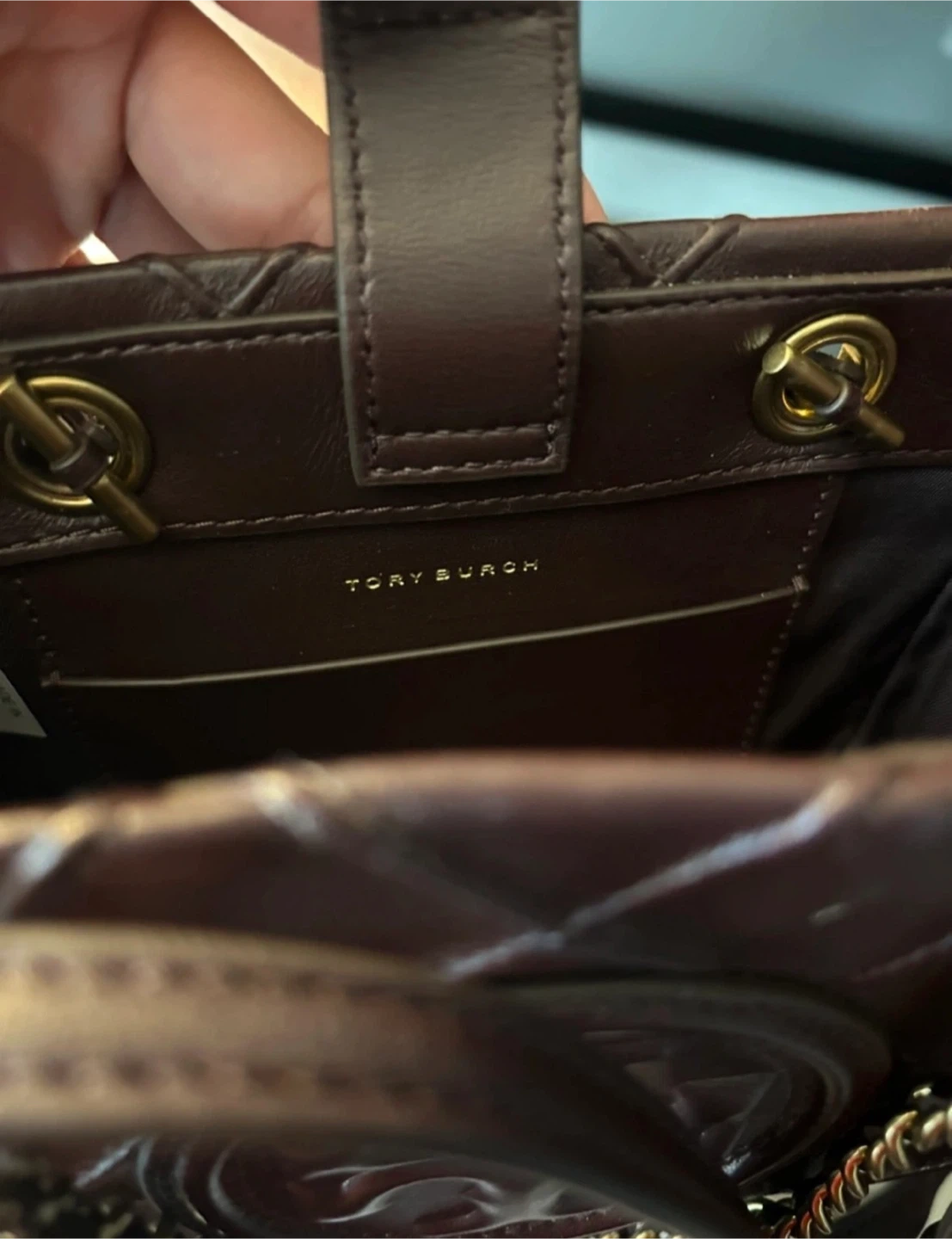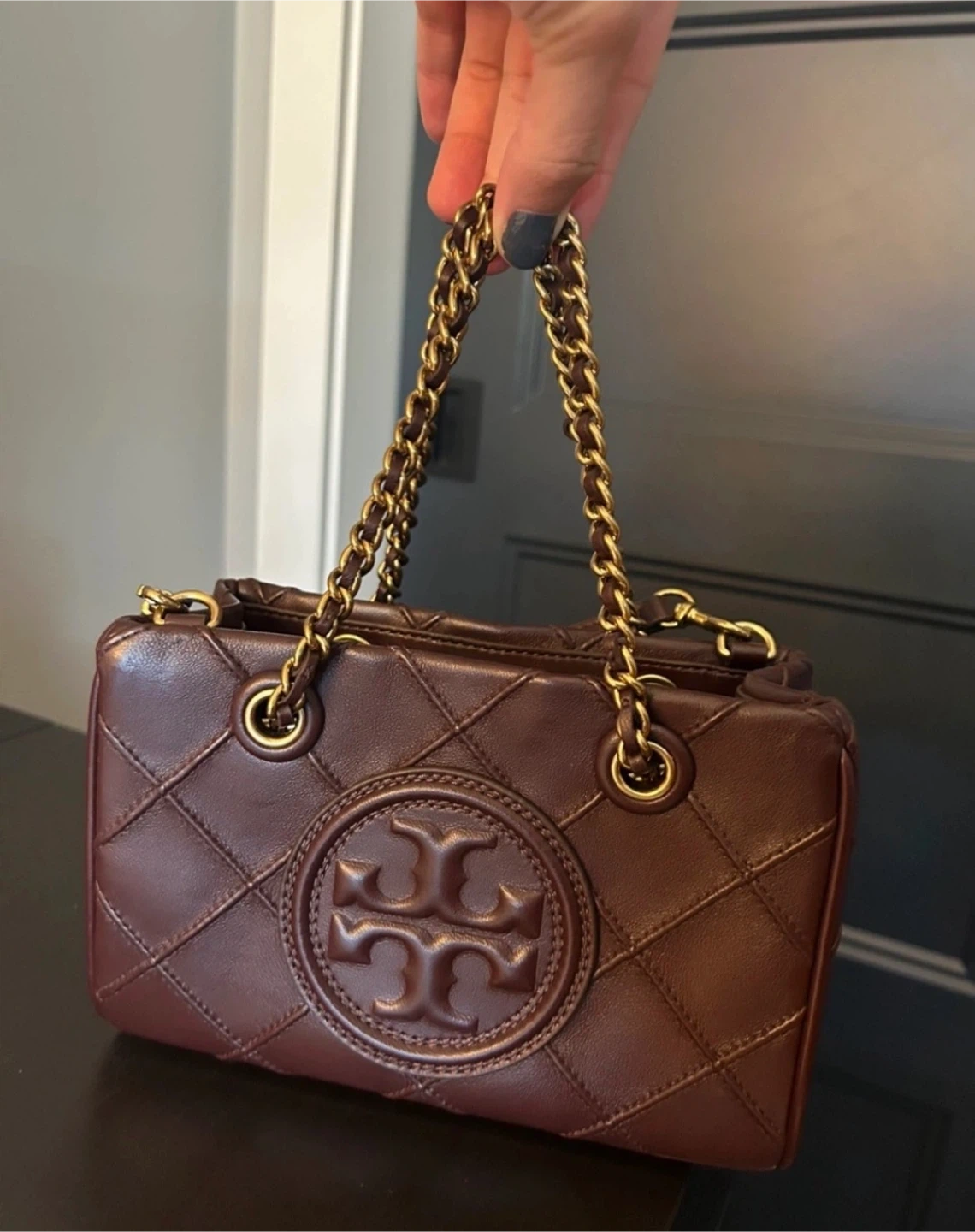Burgundy Tory Burch mini Fleming bag with short gold chain strap and long detachable leather shoulder strap.