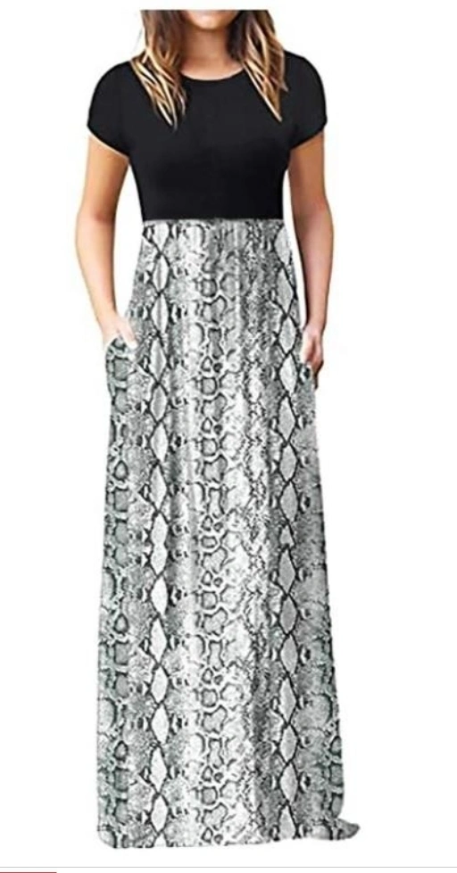 This maxi dress features a black top and a snakeskin print bottom. It has short sleeves and pockets. Perfect for a casual day out!