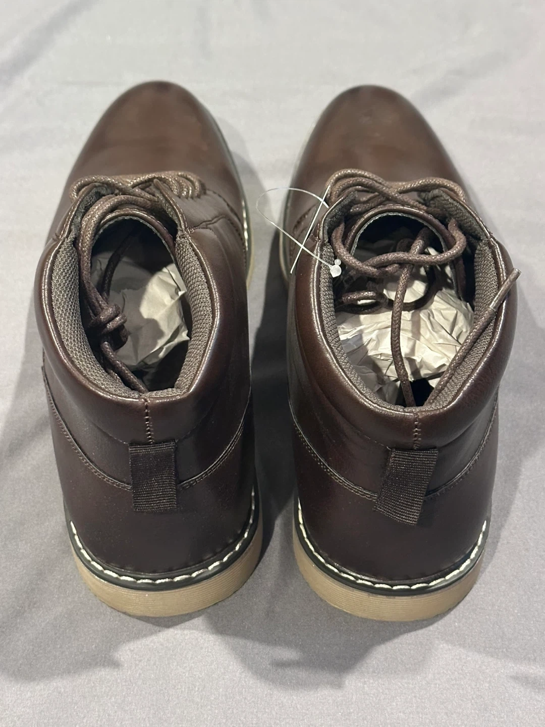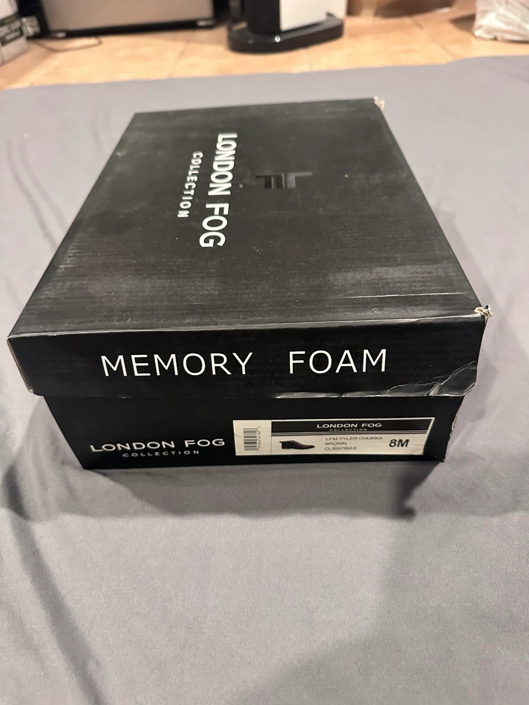 These London Fog men's chukka boots are a rich brown color and size 8M. They feature memory foam insoles for comfort. Includes original box and packaging.