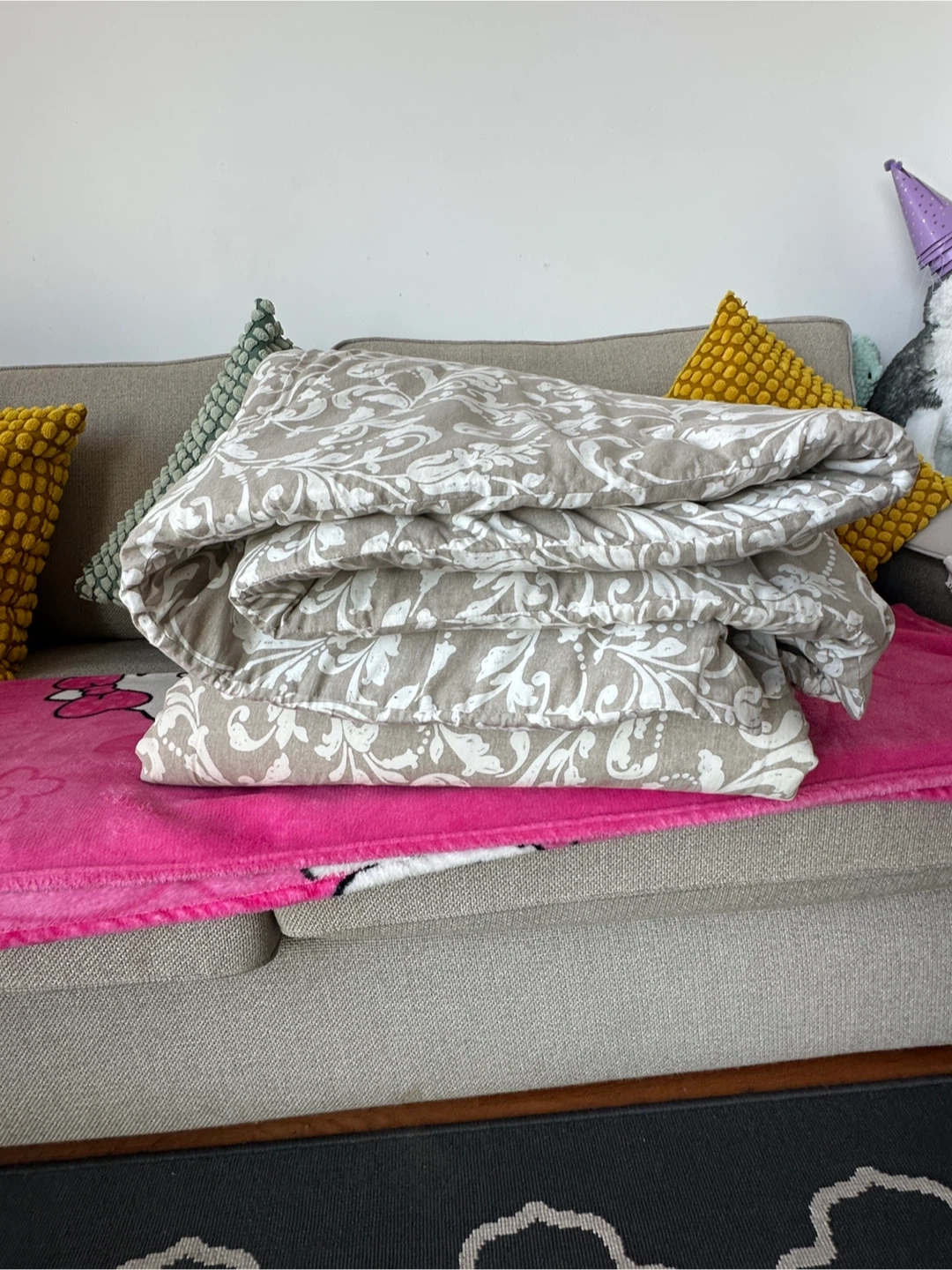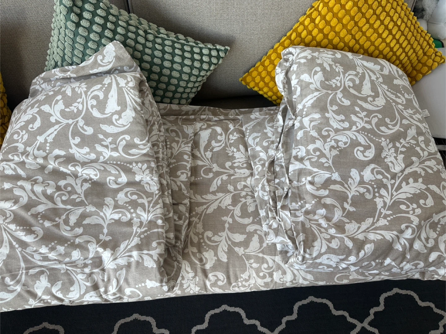This duvet plus the cover which has a classic damask pattern in beige and white. It's made of a soft fabric, perfect for any bedroom. Provides a cozy feel for comfortable sleep!