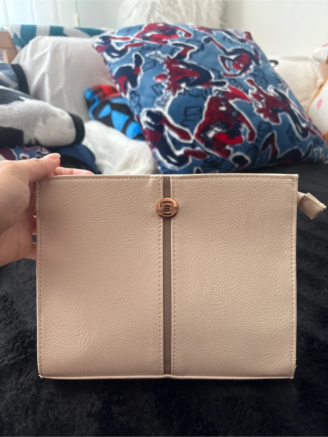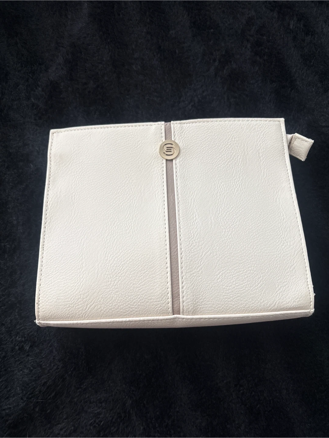 This is a cream-coloured Skechers cosmetic bag. It's made of a faux leather material and features a subtle S logo in the centre. Great for organizing your makeup and toiletries! Pick up cash only