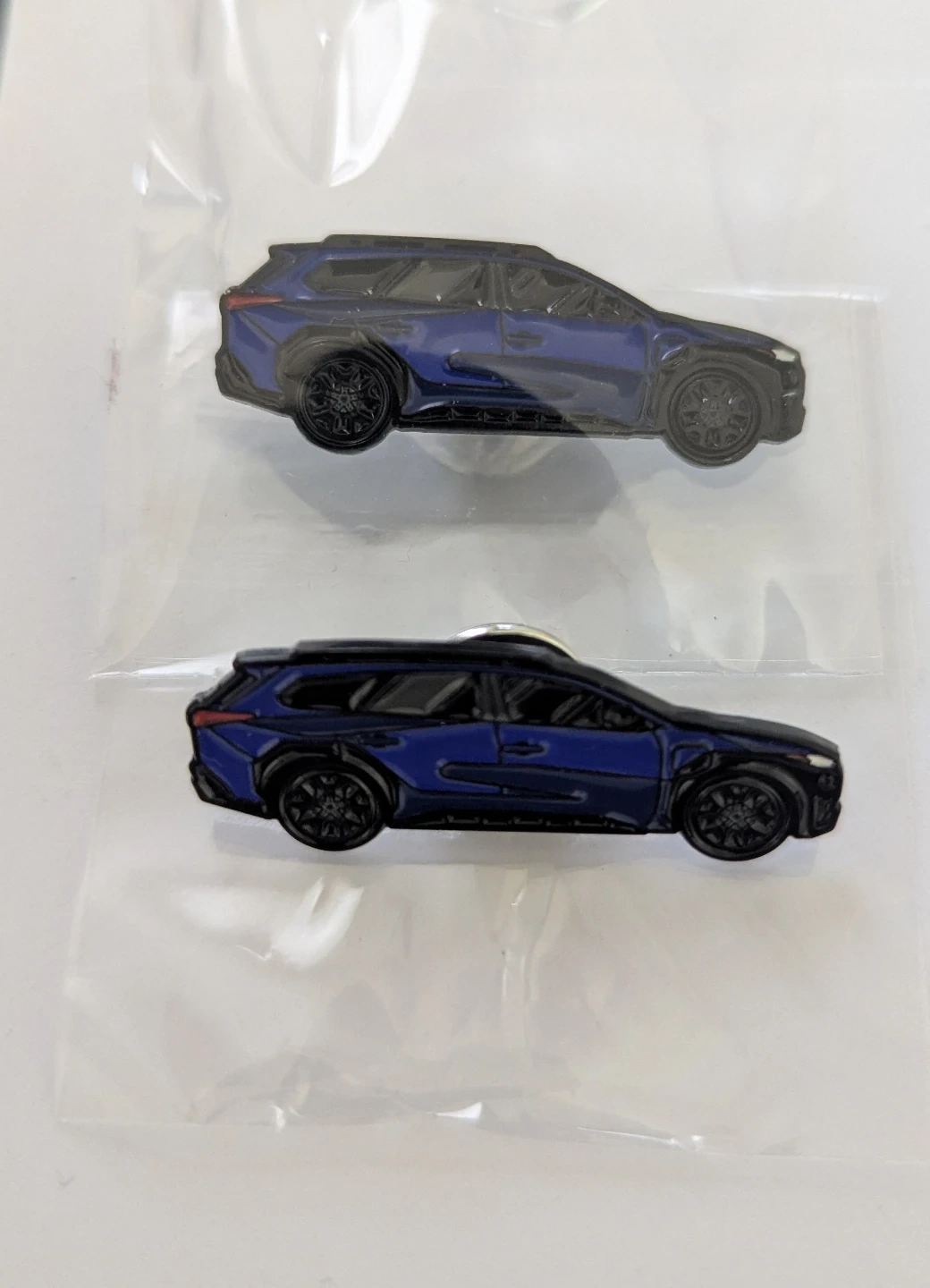 These are two blue station wagon Subaru EV enamel pins from the CIAS auto show. Official pins by Subaru Canada. Great for jackets / bags / collecting !
