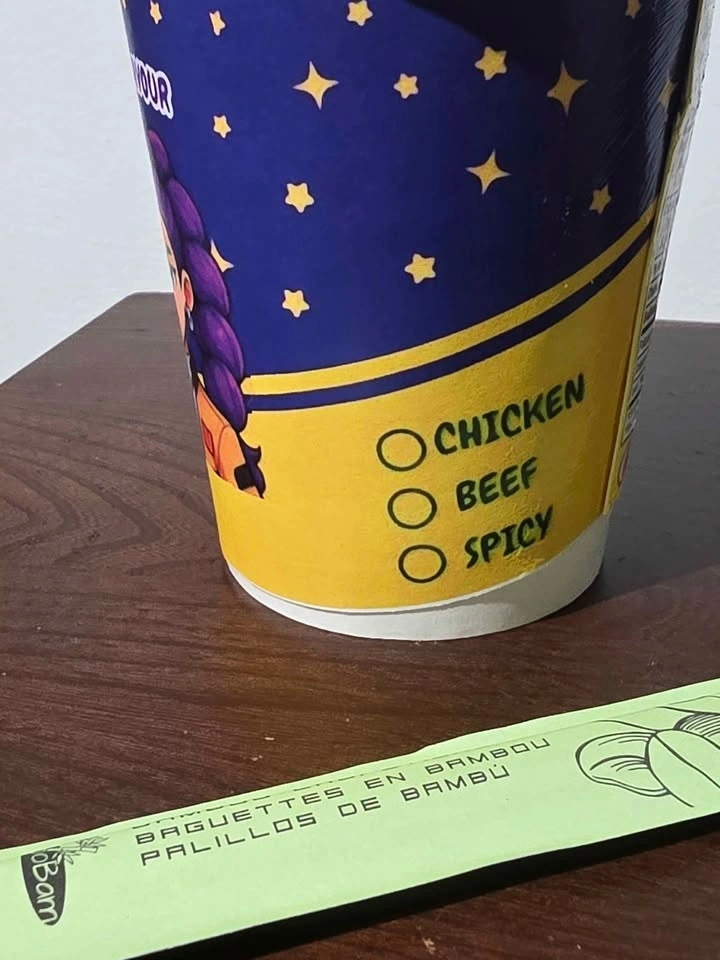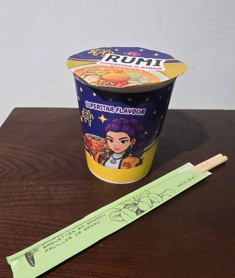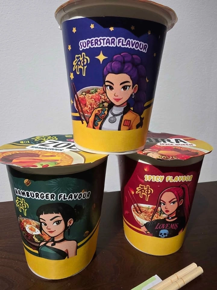 K-pop Demon Hunters ramen cups featuring 3 different designs: Tumi, Zoey, and Mira. Each cup has a flavor option on the side. Great for K-pop lovers, Easter, birthdays, or Christmas. Each soup comes with a pair of chopsticks. $5 each. Ask me about custom orders!