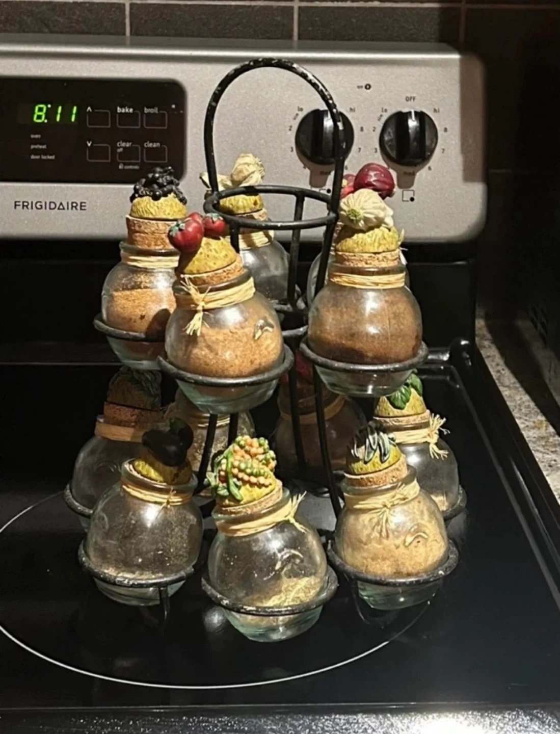 Spice rack with 10 glass jars. The jars have decorative fruit and vegetable toppers. Perfect for adding a touch of charm to your kitchen!