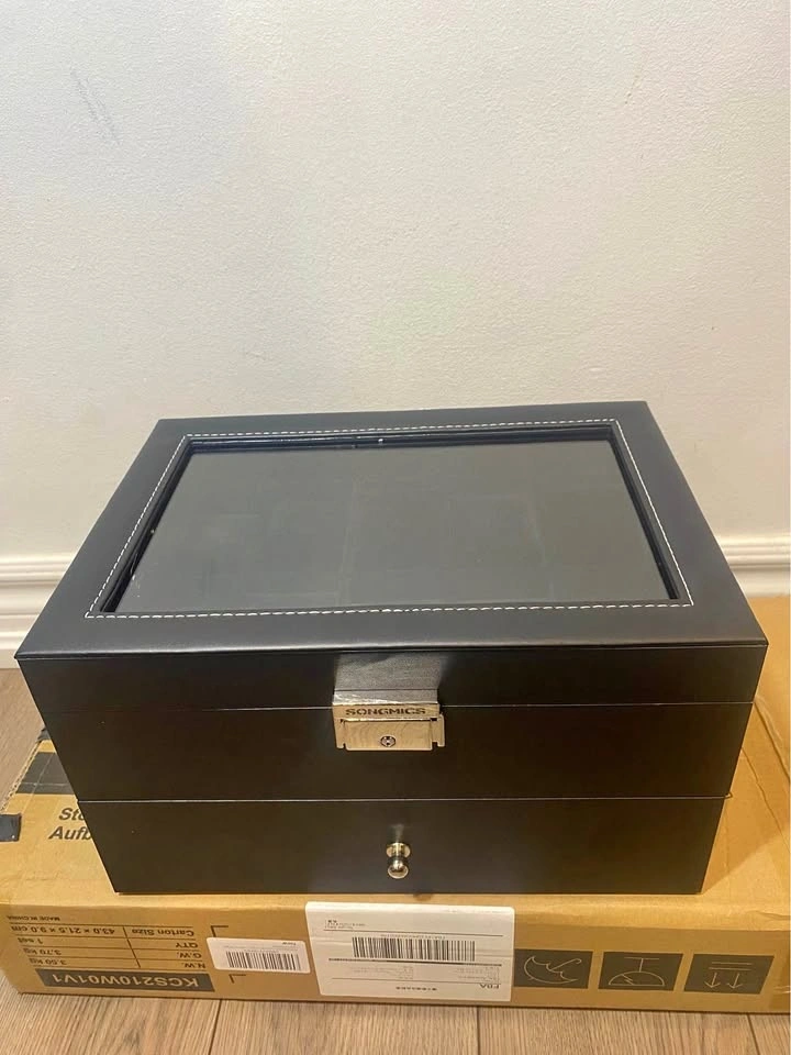 Spacious SONGMICS watch box with 20 slots for all your watches. Features 12 slots on top with a glass lid and 8 in a pull-out drawer. Made of black synthetic leather with white stitching. Handy for keeping your collection organized and safe. Measures 11.2" wide, 8.1" deep, and 6.5" tall. Fits watches with dial size up to 48 mm. Pick up in Pickering at Brock Road and Rex Heath Drive.