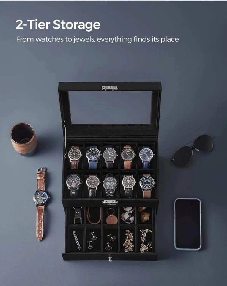 SONGMICS 20-Slot Watch Box Organizer Black Synthetic Leather