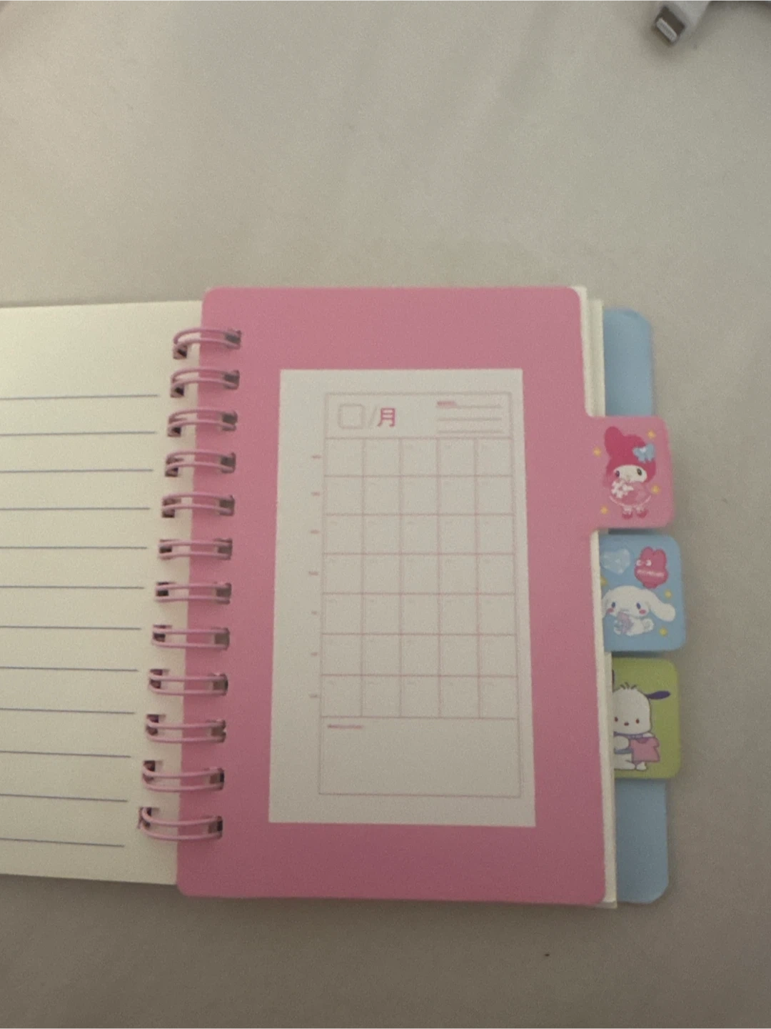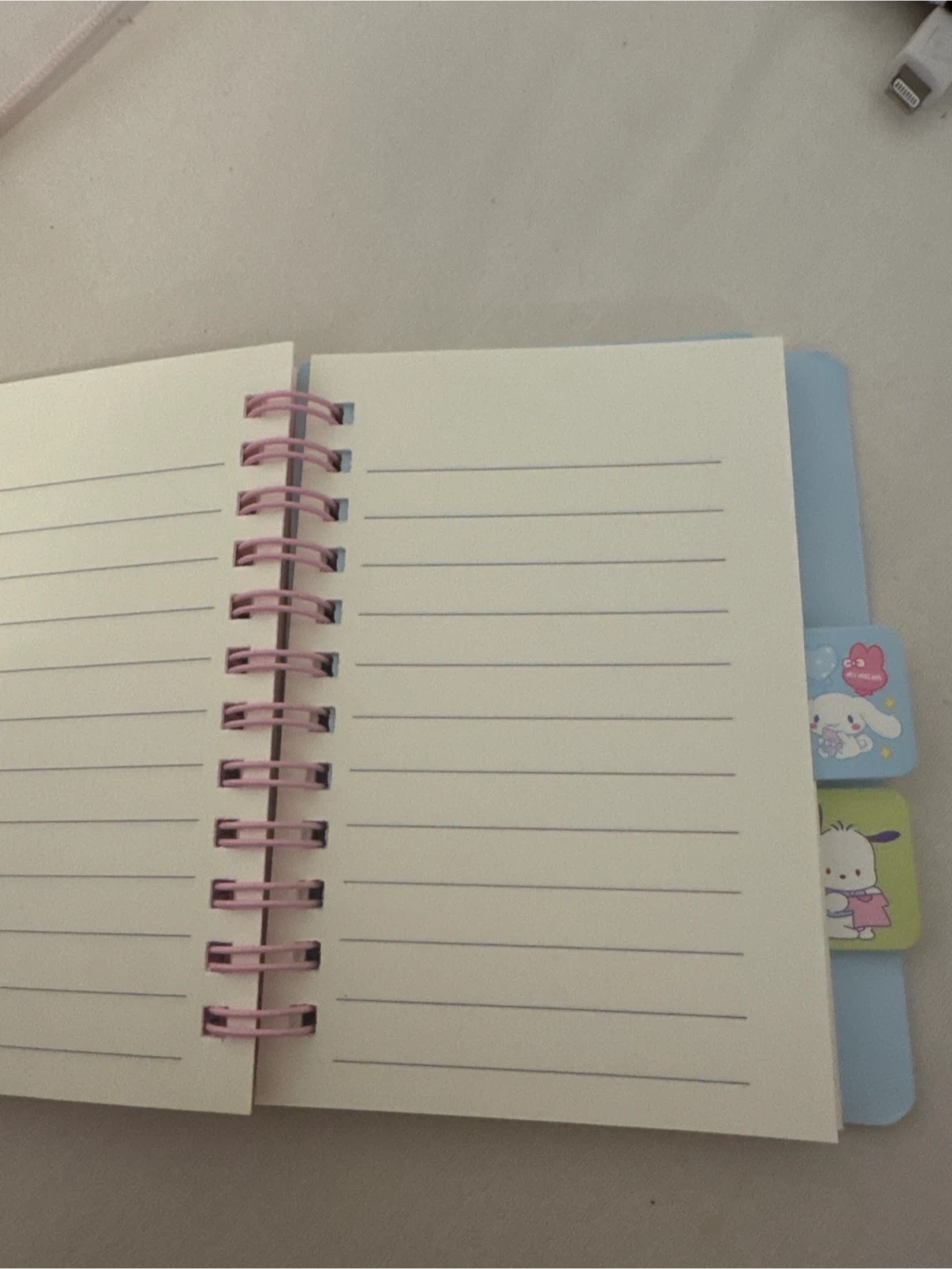 NOT USED! This cute spiral notebook features Cinnamoroll and friends on the cover. It includes lined pages for writing and tabbed dividers with character art. It's perfect for school notes or journaling!
