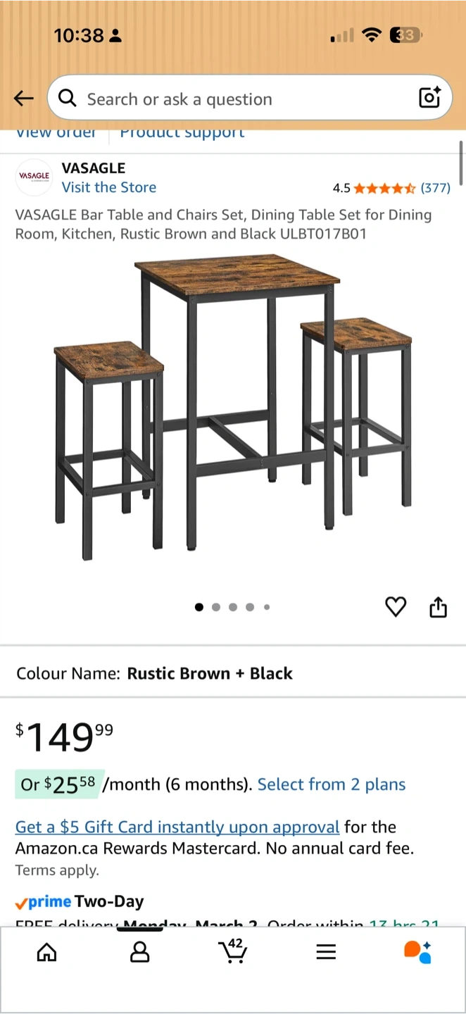 Buy & SellVASAGLE Bar Table and Chairs Set - Rustic Brown and BlackVASAGLE Bar Table and Chairs Set - Rustic Brown and Black$90This is a VASAGLE bar table and chairs set. It's in a rustic brown and black colour. The set is designed for dining rooms or kitchens.ConditionLike newWHERE TO MEETYonge-CollegeView MapSELLERverifiedMelodyChurch and Wellesley1074 reviews4 chats·0 favorites·74 viewsSEND CHAT TO SELLERHi Melody! I’m interested in your listing.Hi Melody! I’m interested in your listing.Get the Karrot app to chatSign In to chat
