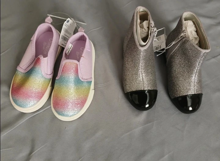 Adorable OshKosh B'gosh slip-on shoes with a rainbow glitter design and elastic sides. Also includes sparkly silver ankle boots with a black cap toe and zipper closure. Both pairs are for girls and come with tags. Size 8