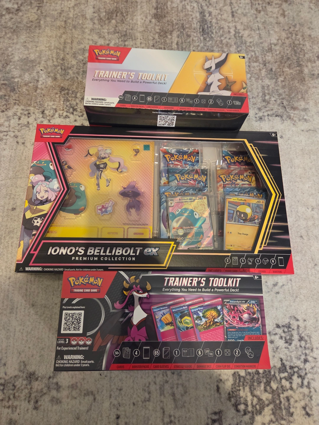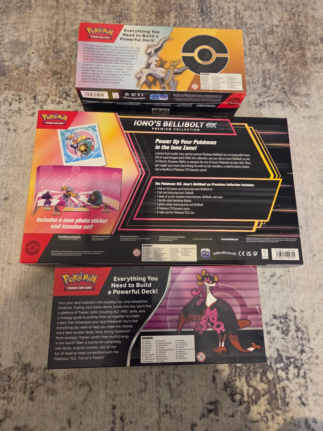 Iono’s Bellibolt ex Premium Collection: Includes a full-art Iono's Bellibolt ex promo, Tadbulb foil, a set of Iono-themed acrylic standees, a sticker, and 6 booster packs.