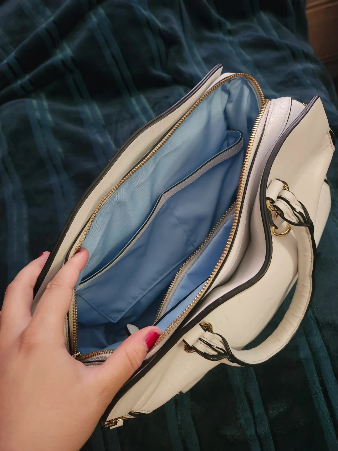 This White Leather Satchel Handbag has a light blue lining and 3 interior pockets and 1 external pocket. It includes a detachable shoulder strap and gold-tone hardware. It's a versatile bag for everyday use.