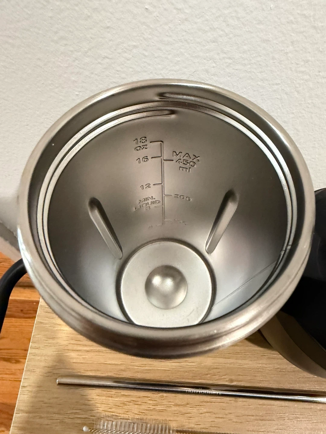 This is a black NutriBullet travel tumbler. It has a maximum capacity of 450 ml (15 oz). It comes with two lids, a metal straw, and a straw cleaning brush. The tumbler is designed for on-the-go beverages.