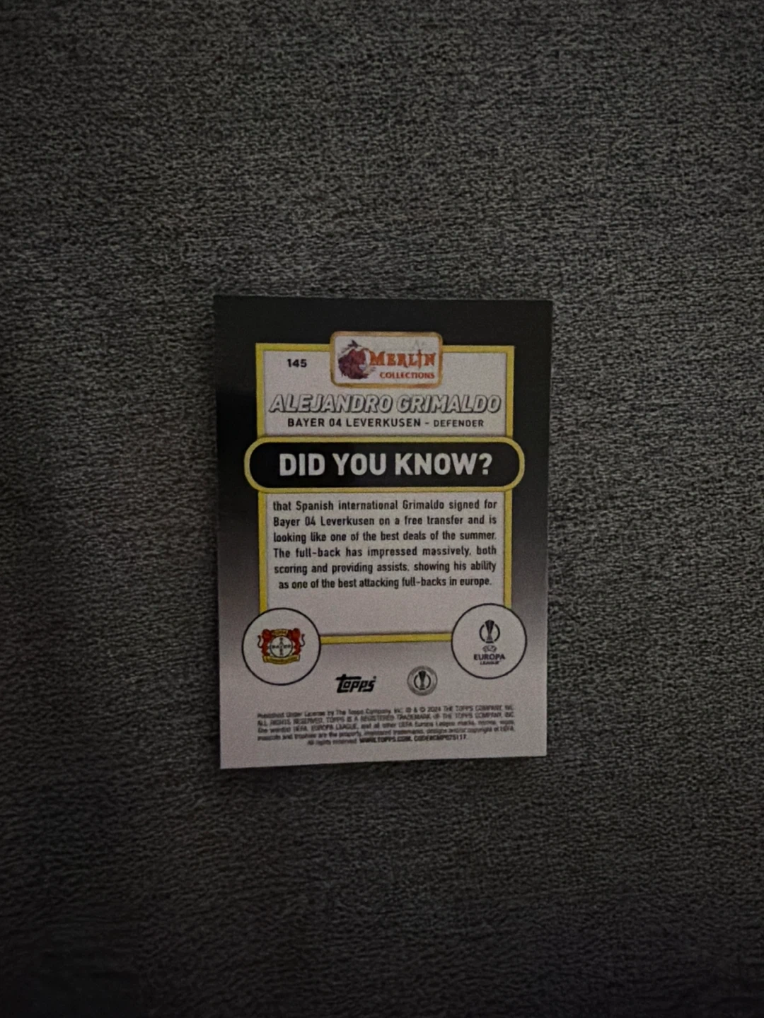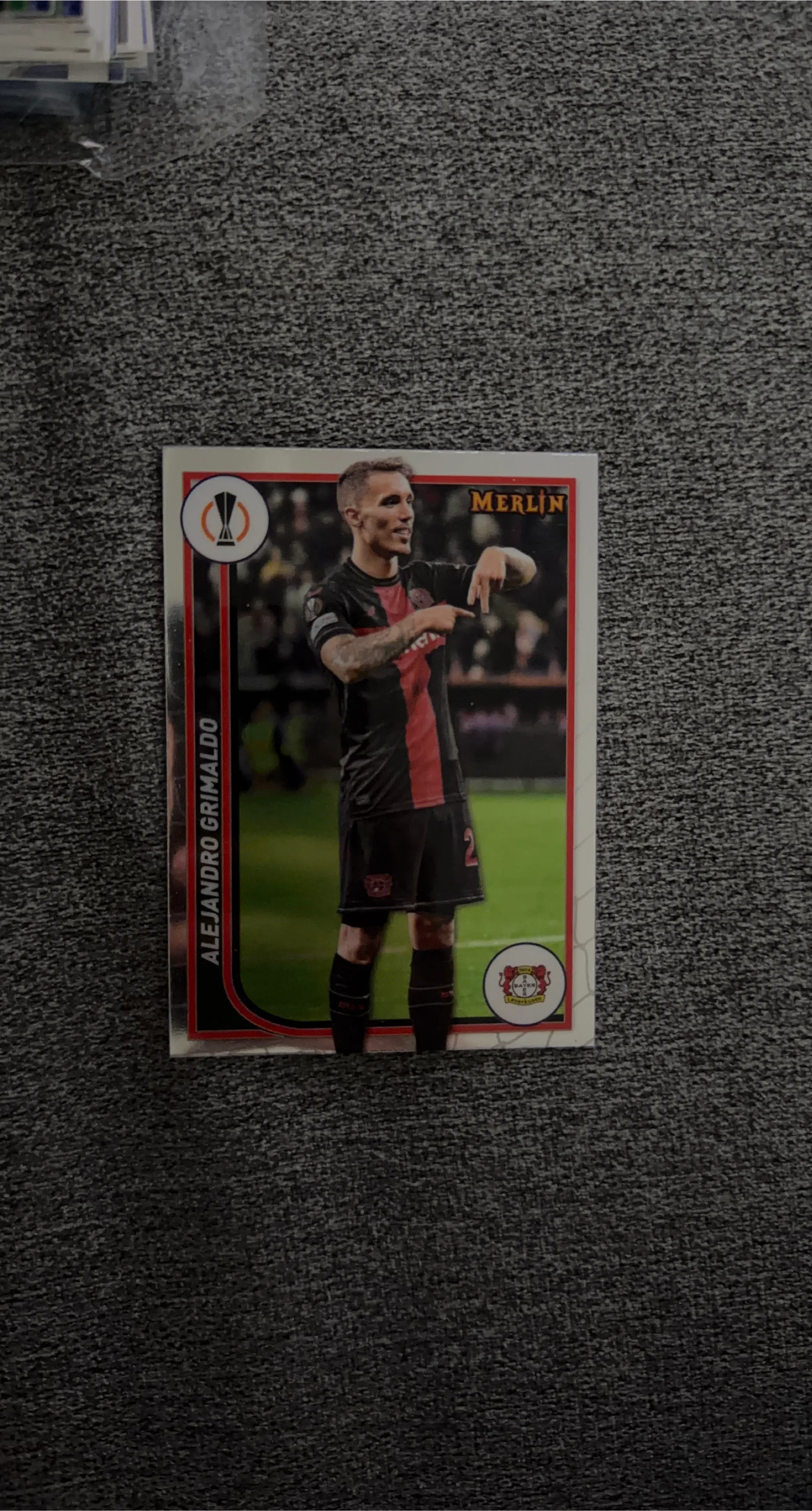 Merlin Collections soccer trading card featuring Alejandro Grimaldo of Bayer 04 Leverkusen. The card is from the 2023-2024 Europa League collection. Includes interesting facts about the player on the back.