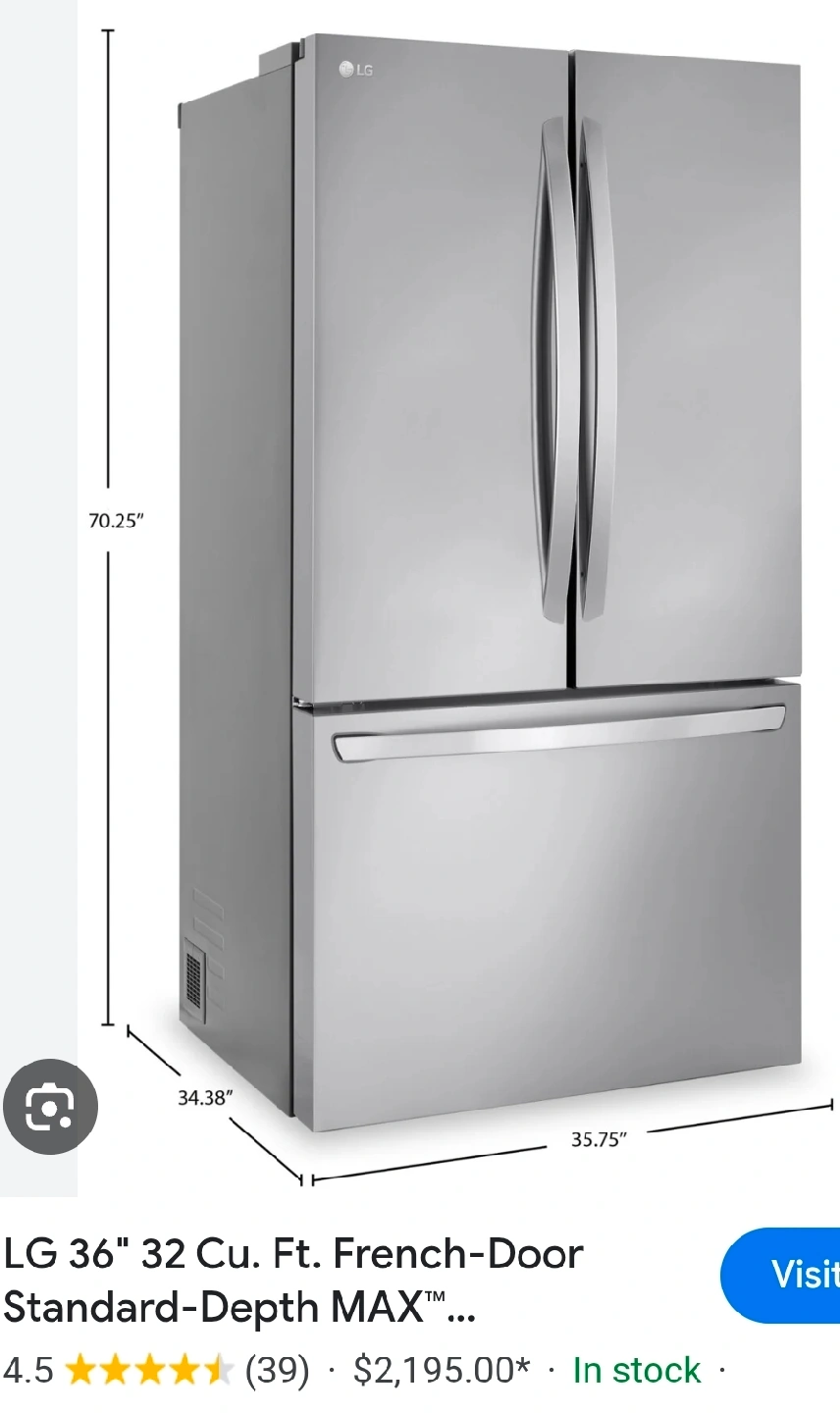 Selling an LG 36" French-Door Standard-Depth MAX refrigerator. It's a great size at 32 cu ft! Dimensions are approximately 70.25" tall, 34.38" deep, and 35.75" wide. Retails for $2,195