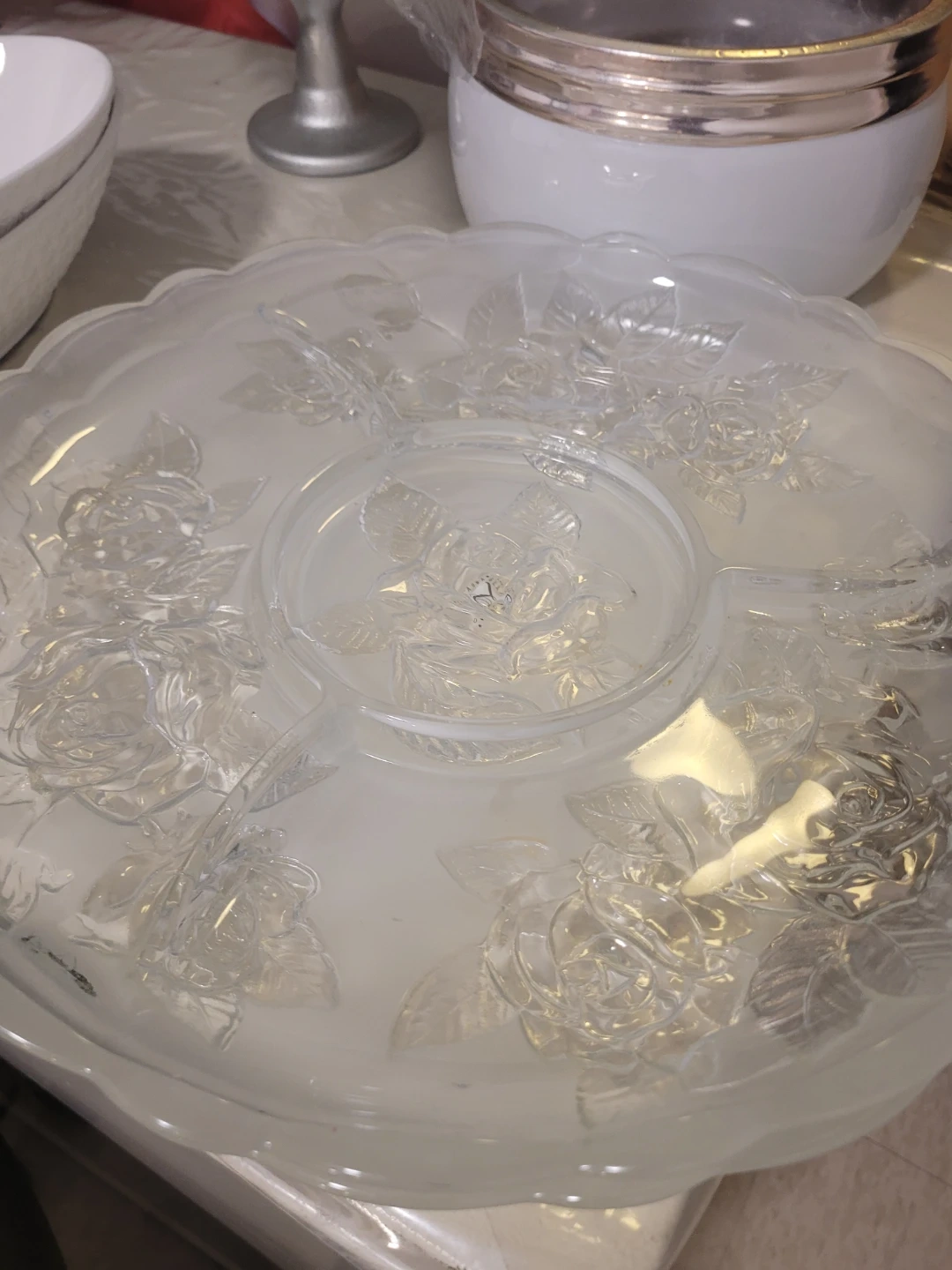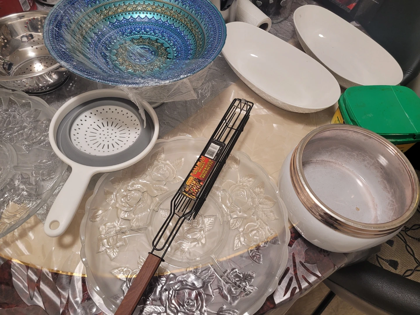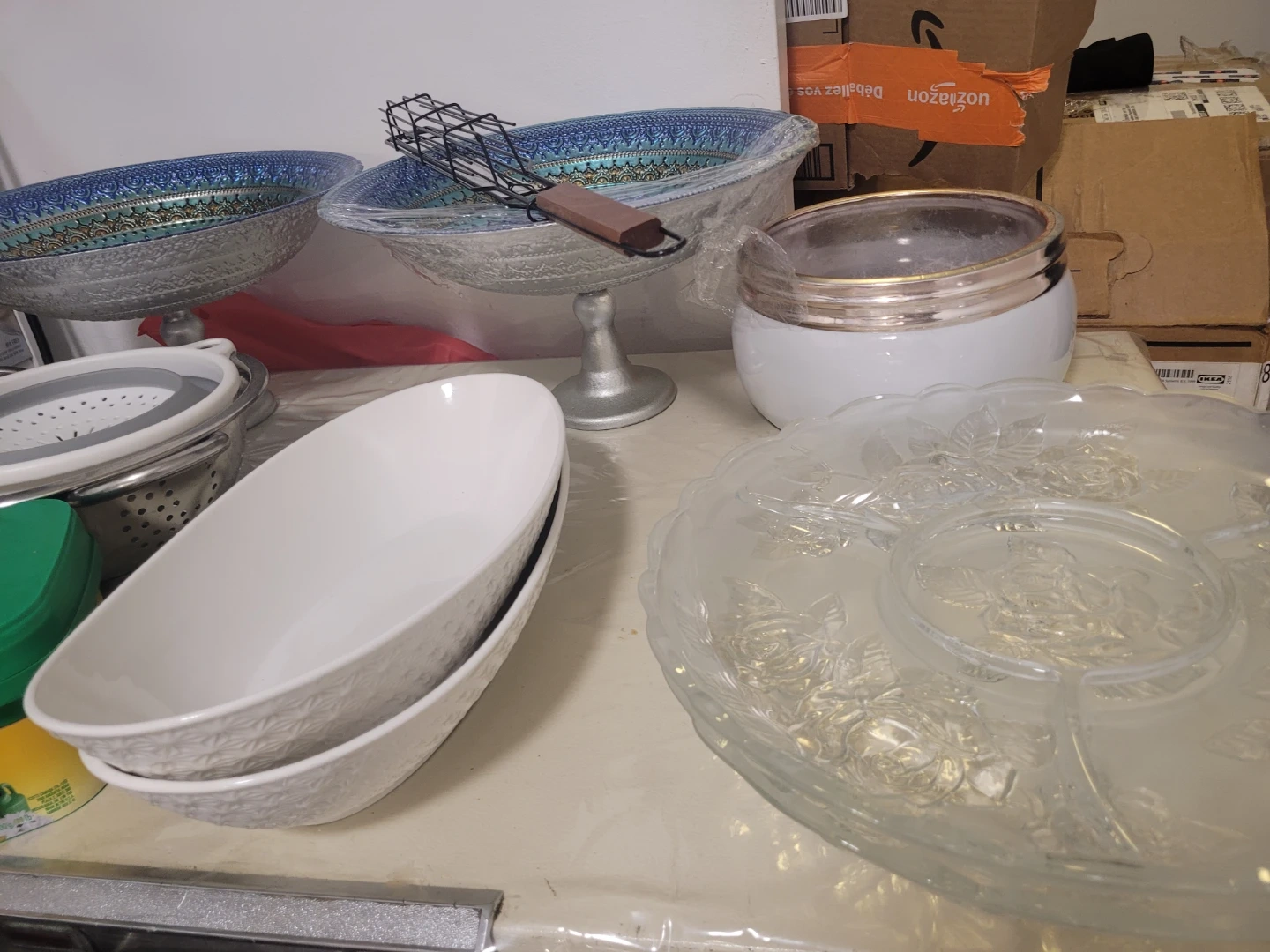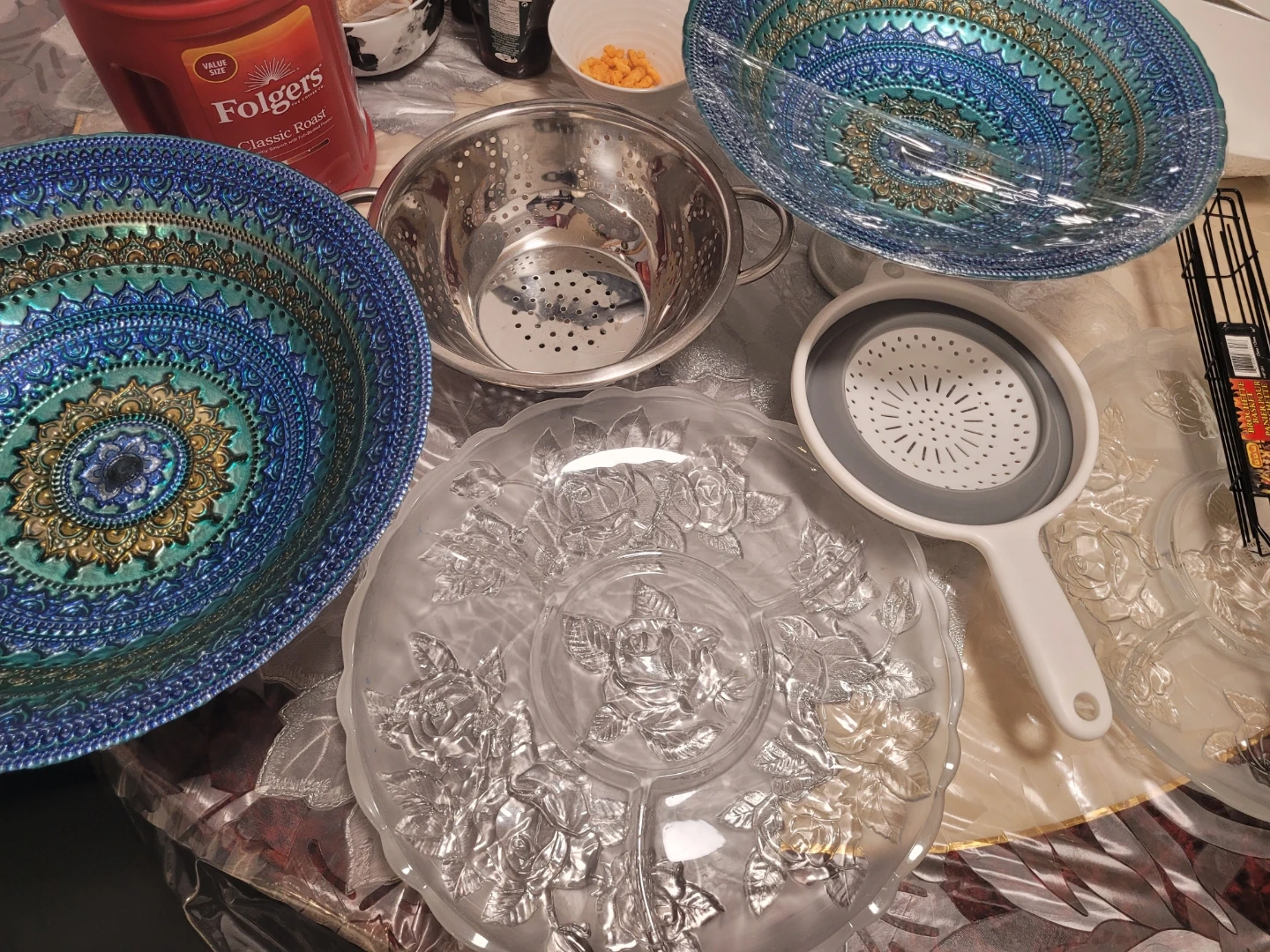 This set includes two decorative blue serving bowls with intricate patterns, a stainless steel colander, and a clear glass divided serving platter embossed with roses. Also includes a white plastic handled strainer. Some items are still in protective wrapping. Everything for $30