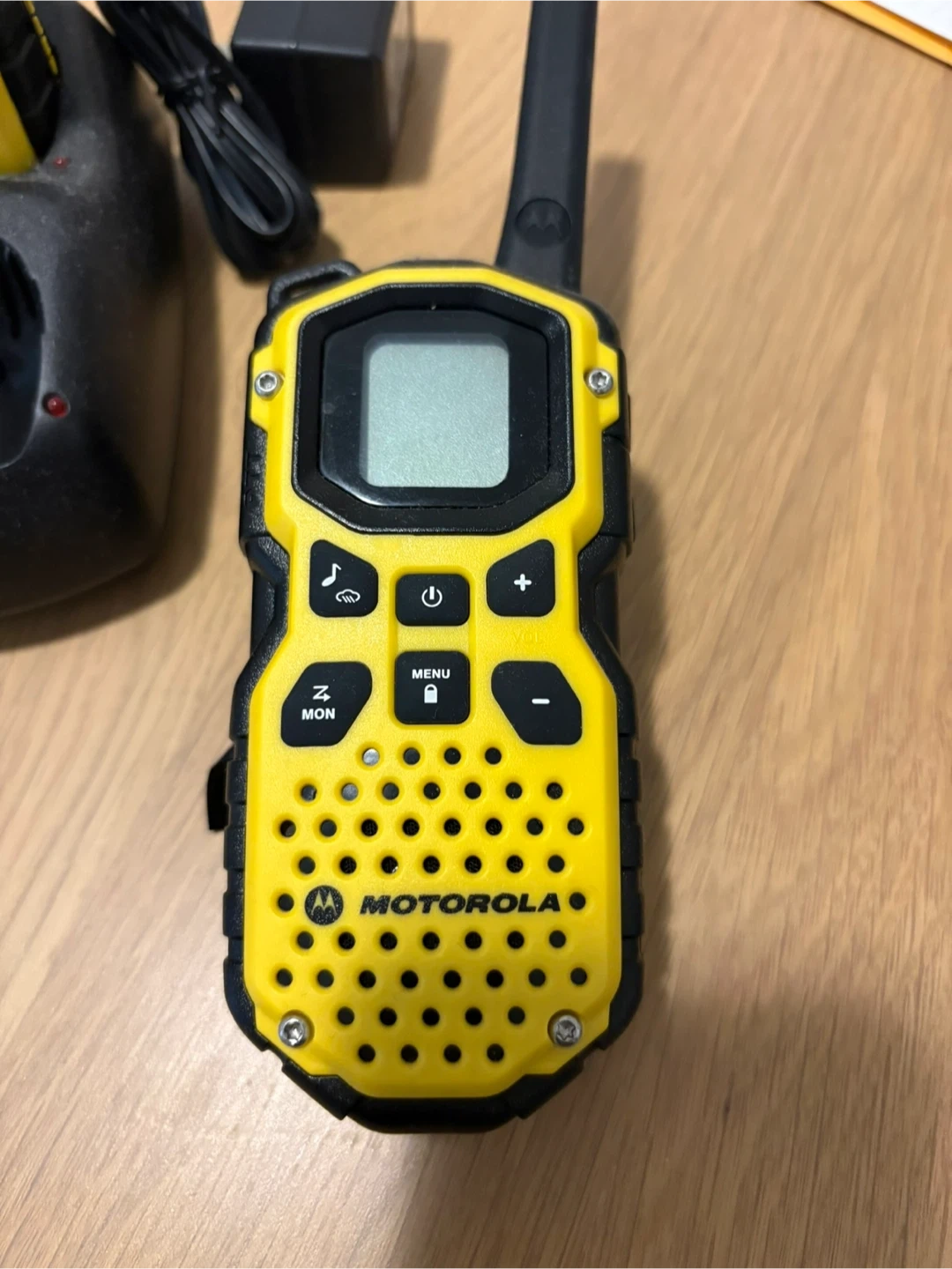 Two Motorola Talkabout two-way radios in yellow and black. Includes charging base and adapter. These radios are ready for your next adventure!