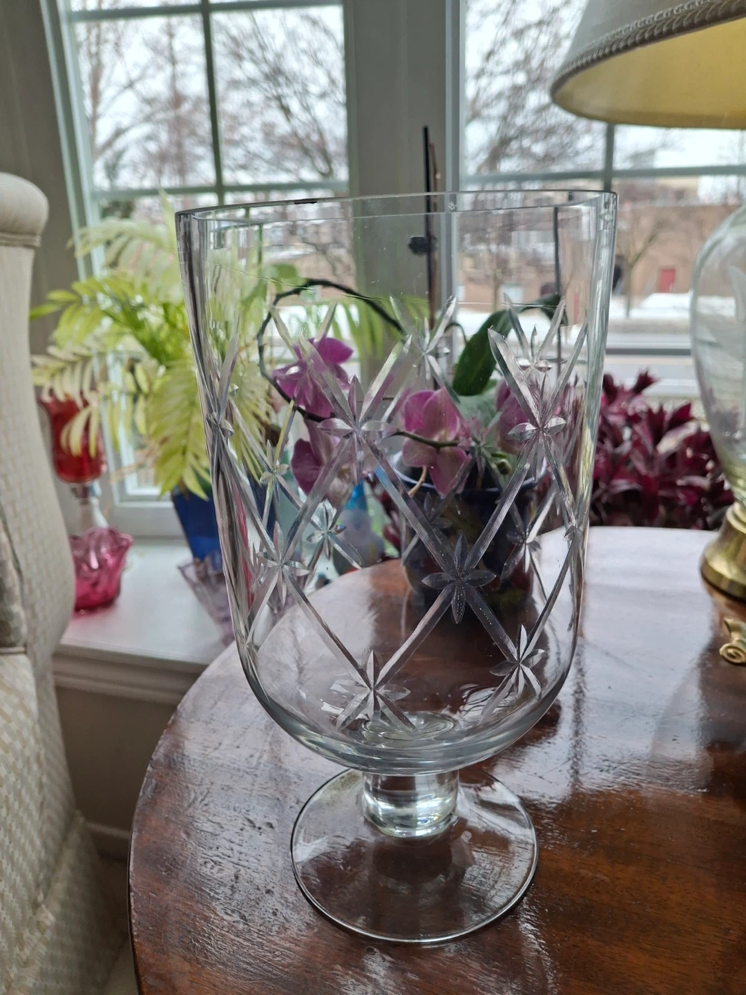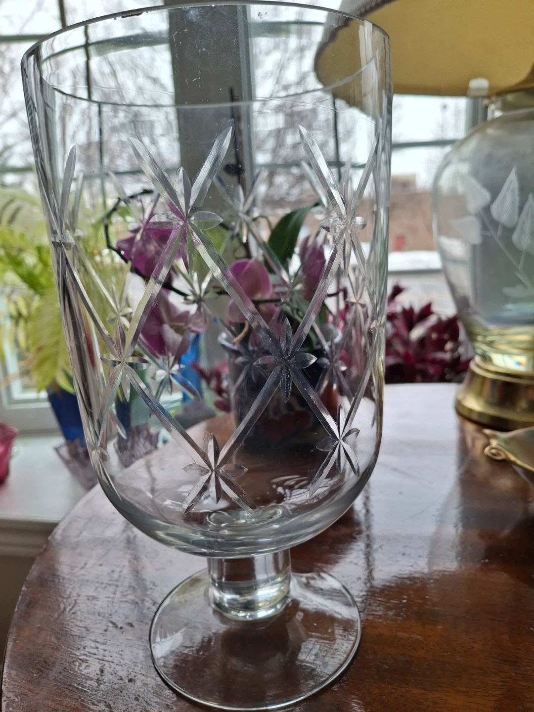 Glass candle holder on pedestal, with a pretty etched design. 10” tall and 5.5” across. Excellent condition.