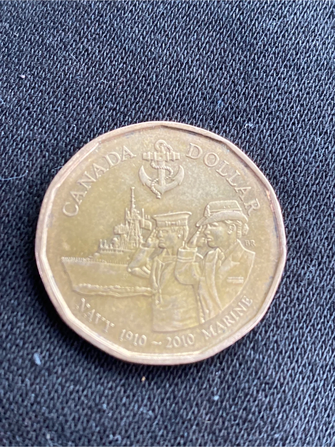 $15- Commemorative Canadian dollar coin from 1910-2010 celebrating the Marine. Features an anchor and a ship on one side and Queen Elizabeth II on the other. A nice addition for collectors!