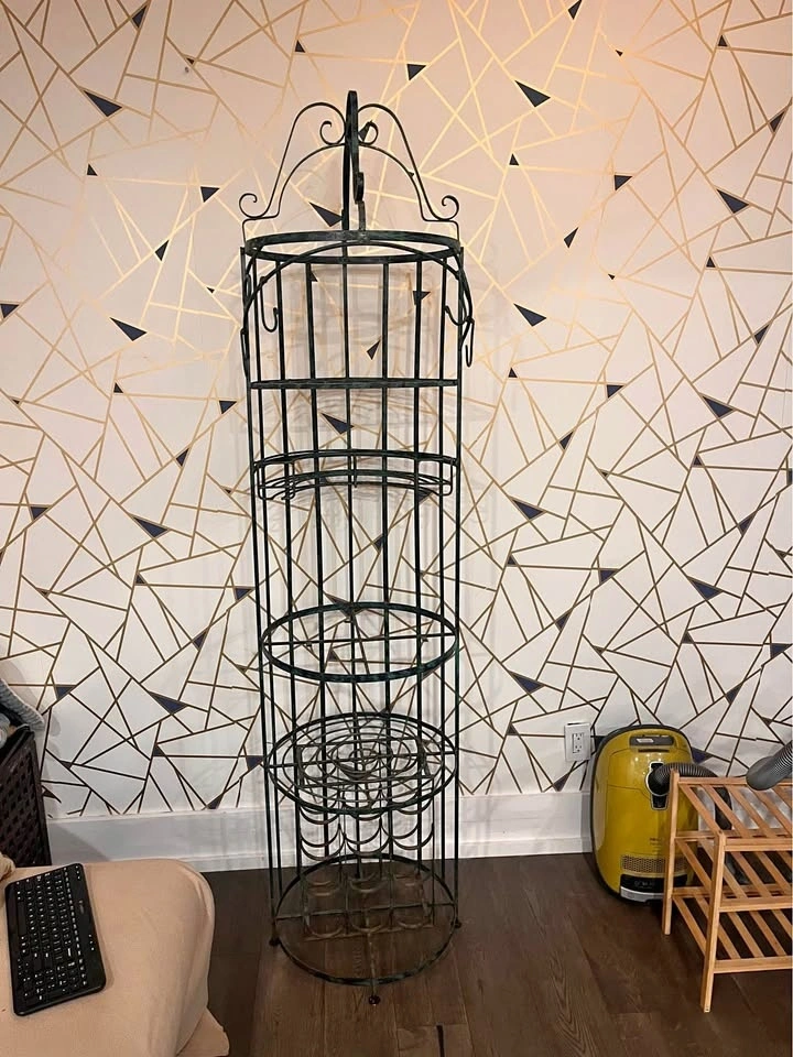 Fabulous wine rack/bar table made of wrought iron. Absolutely sturdy, a.k.a. extra heavy. Lots of potential if you replace the missing table. You can use it as a coat rack, plant stand, or bar table. It's 8ft tall, so please plan on transporting it properly.