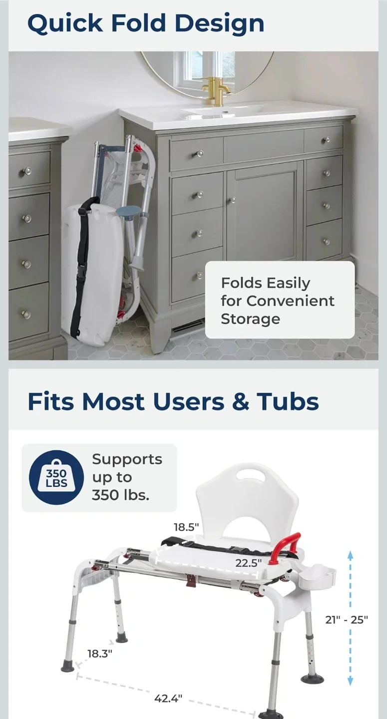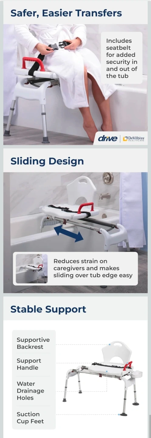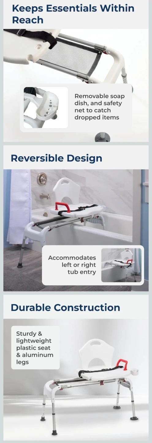 - Sliding seat reduces strain on caregivers and makes sliding over tub edge easy