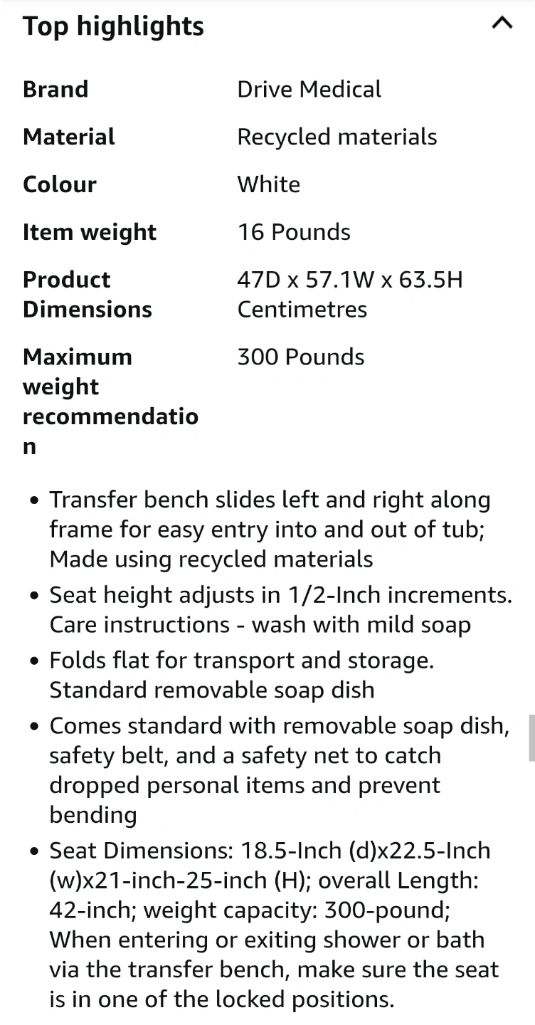 This is a Drive Medical RTL12075 adjustable height sliding transfer bench with armrests and backrest, supporting up to 350lbs. The bench is in new condition, offering secure and comfortable assistance for anyone needing help getting in and out of the tub or shower.
