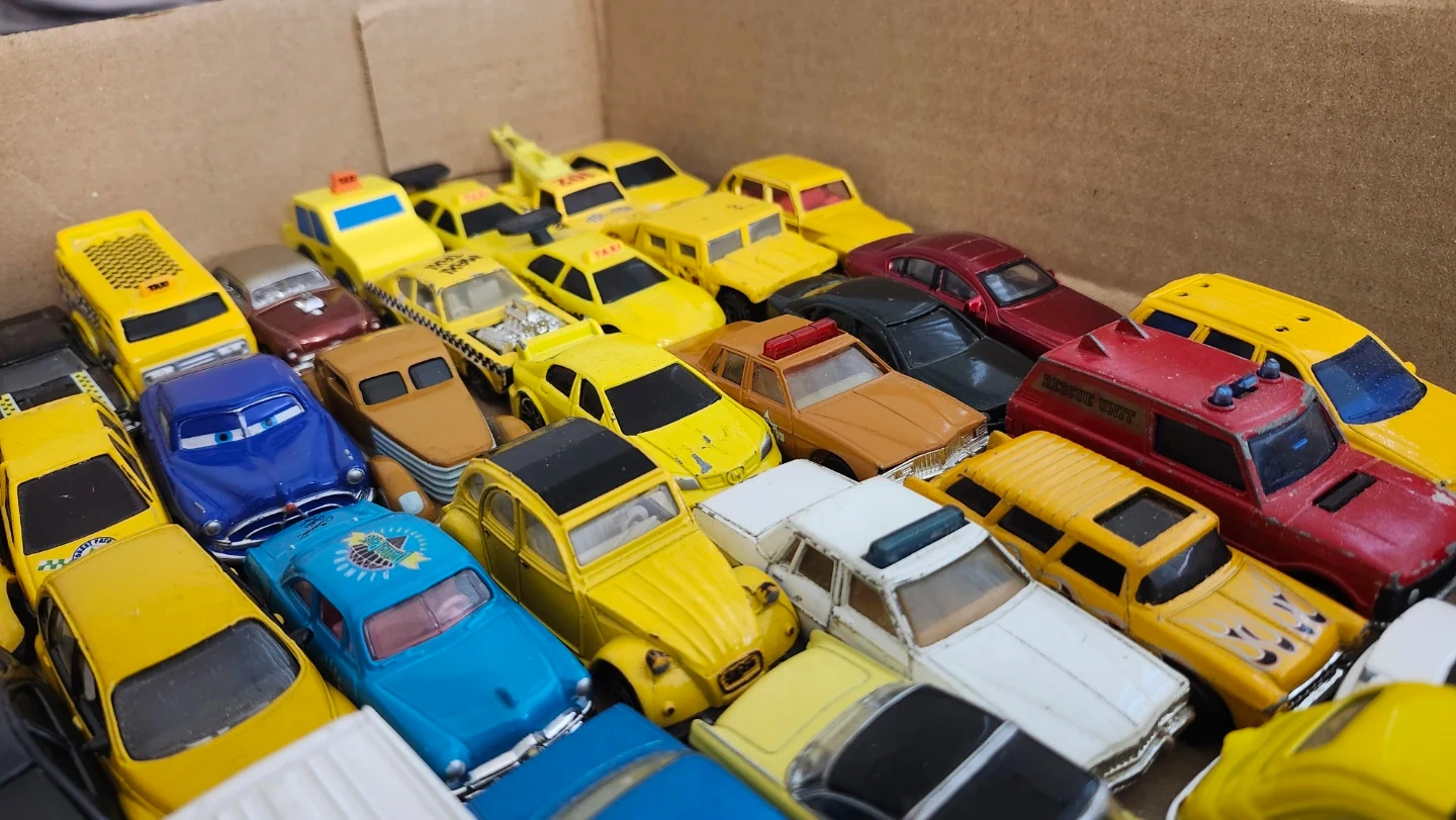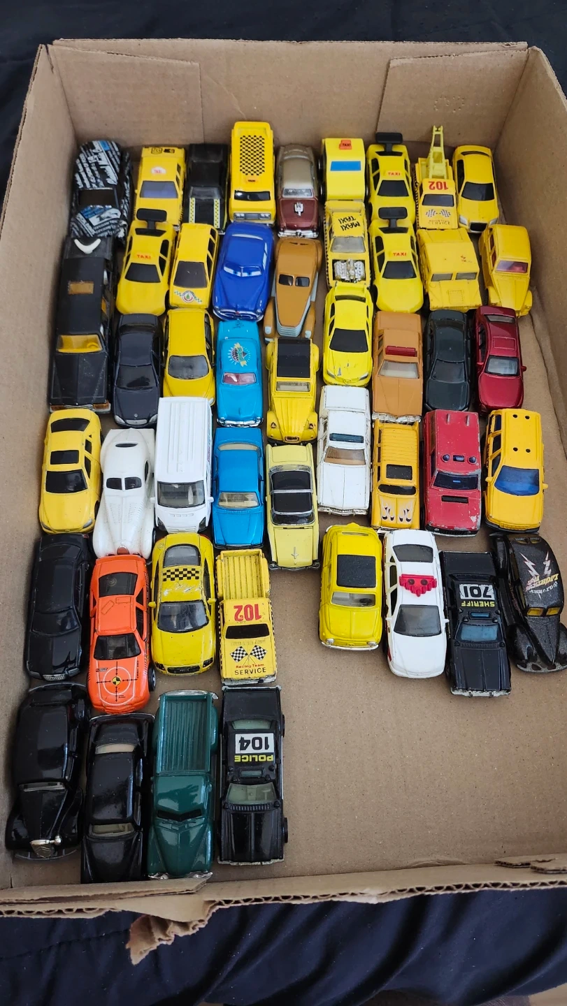 A collection of various die-cast toy cars, including taxis, police vehicles, and other models. They come in different colours and designs.