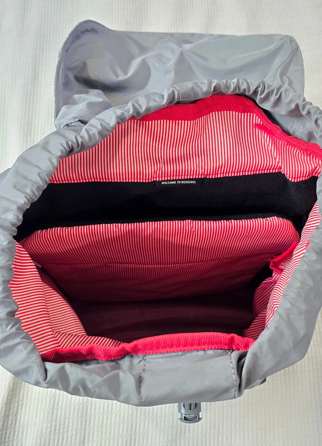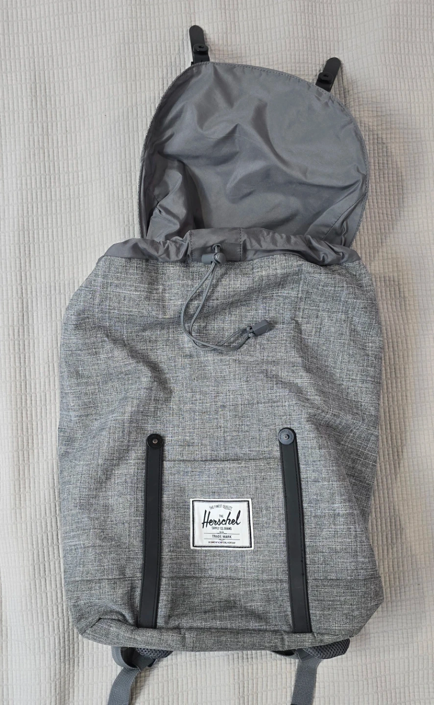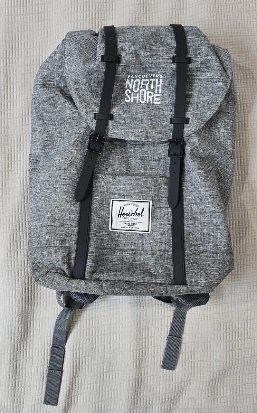 This grey Herschel backpack features a roll-top closure and a "Vancouver's North Shore" graphic. It has a padded laptop sleeve inside. It's made with durable fabric and black accents.