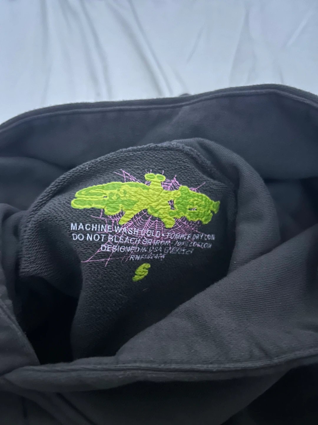 This is a Spider hoodie with a spiderweb graphic. It's made of 100% cotton. Machine wash cold, tumble dry low. LOWEST I CAN DO 70 or 65