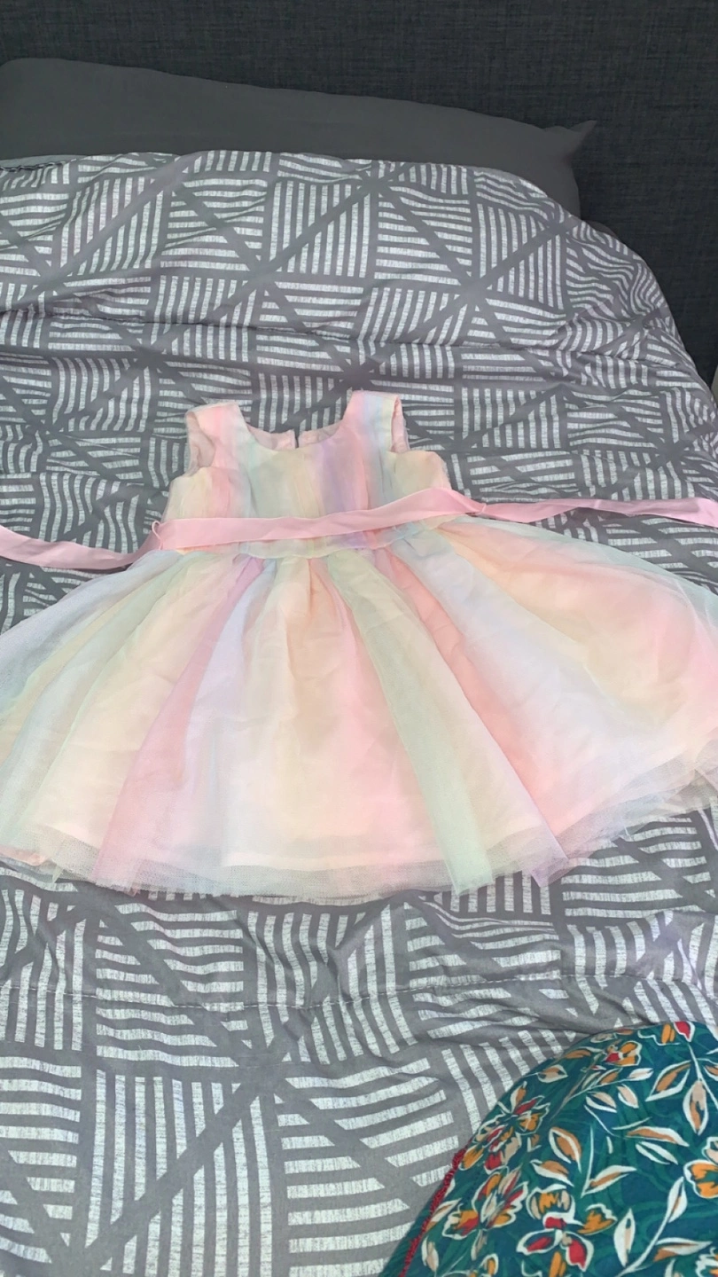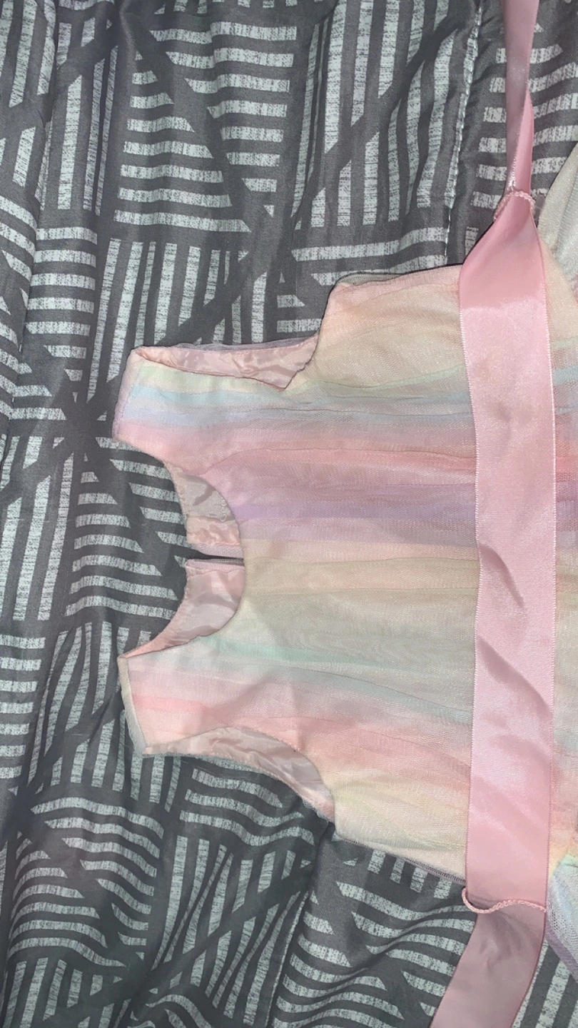 A beautiful pastel rainbow dress, perfect for a special occasion! It features a soft, flowing skirt and a delicate pink ribbon at the waist. The dress is in great condition and ready for a new home