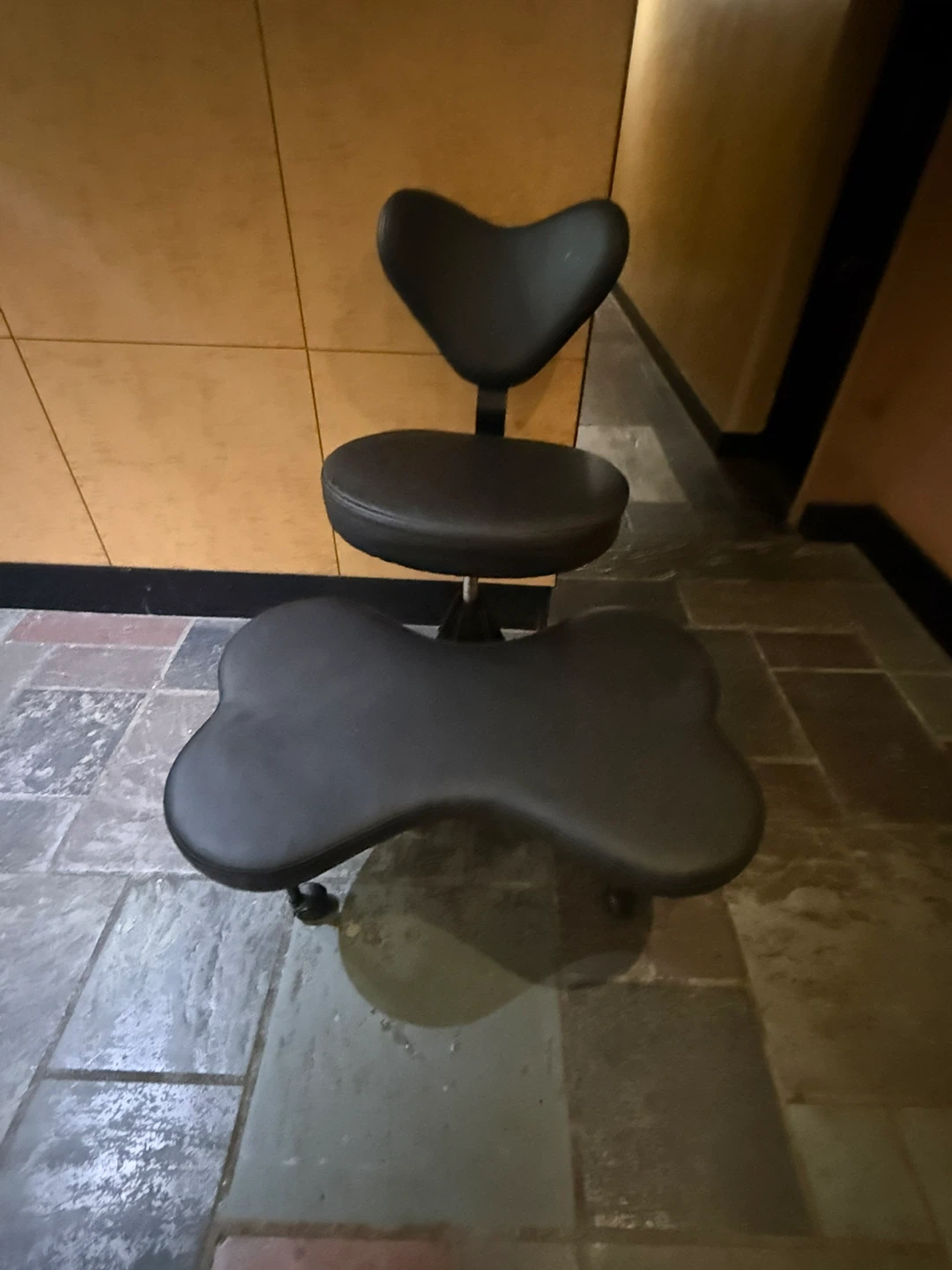 This ergonomic chair features a unique bone shape and adjustable height. It's upholstered in black faux leather and has smooth-rolling casters for easy mobility. This chair is great for anyone needing comfortable seating for extended periods.