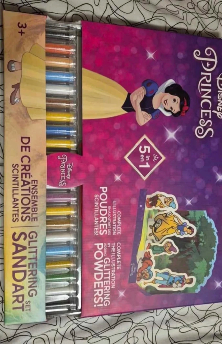 This Disney Princess Glittering Sand Art kit lets you create sparkly art with your favourite characters. It includes 5 different "in 1" colour sets, perfect for young artists. Recommended for ages 3 and up!
