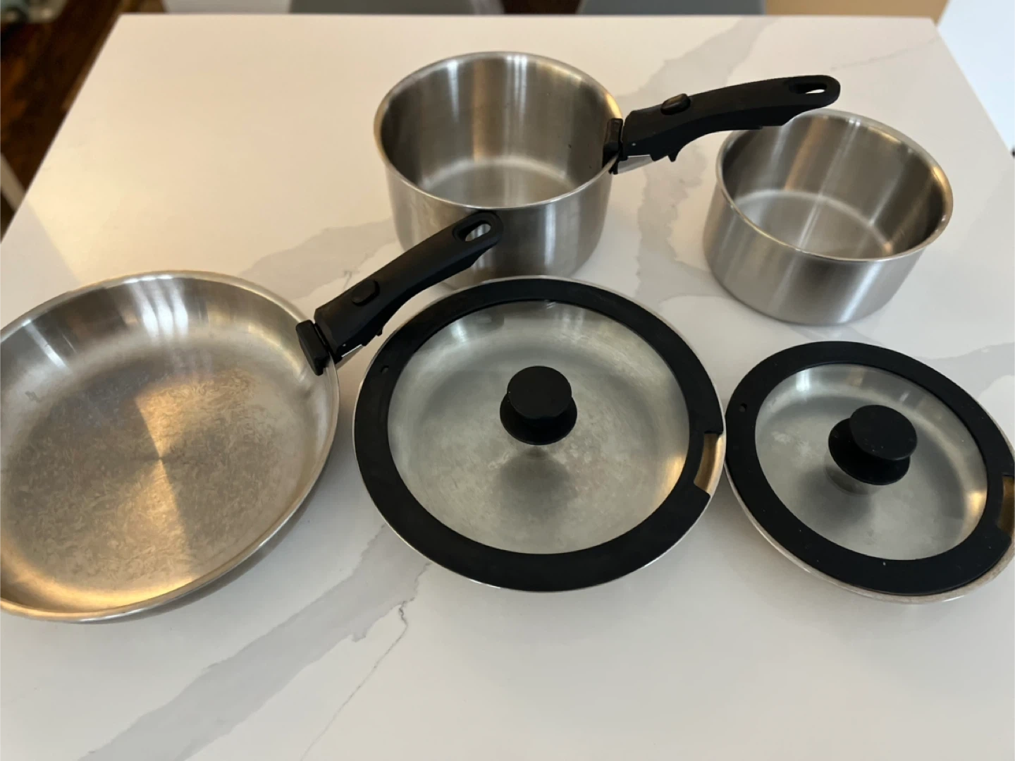 This set includes a frying pan, a saucepan with a lid, and two small pots. All pieces are made of stainless steel with black handles. Two additional glass lids with black rims and handles are also included.