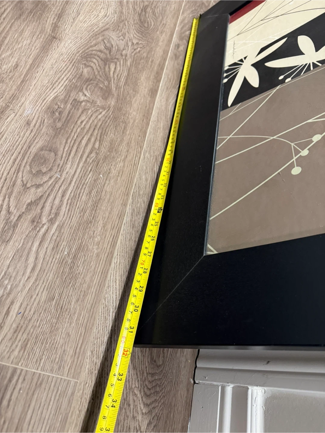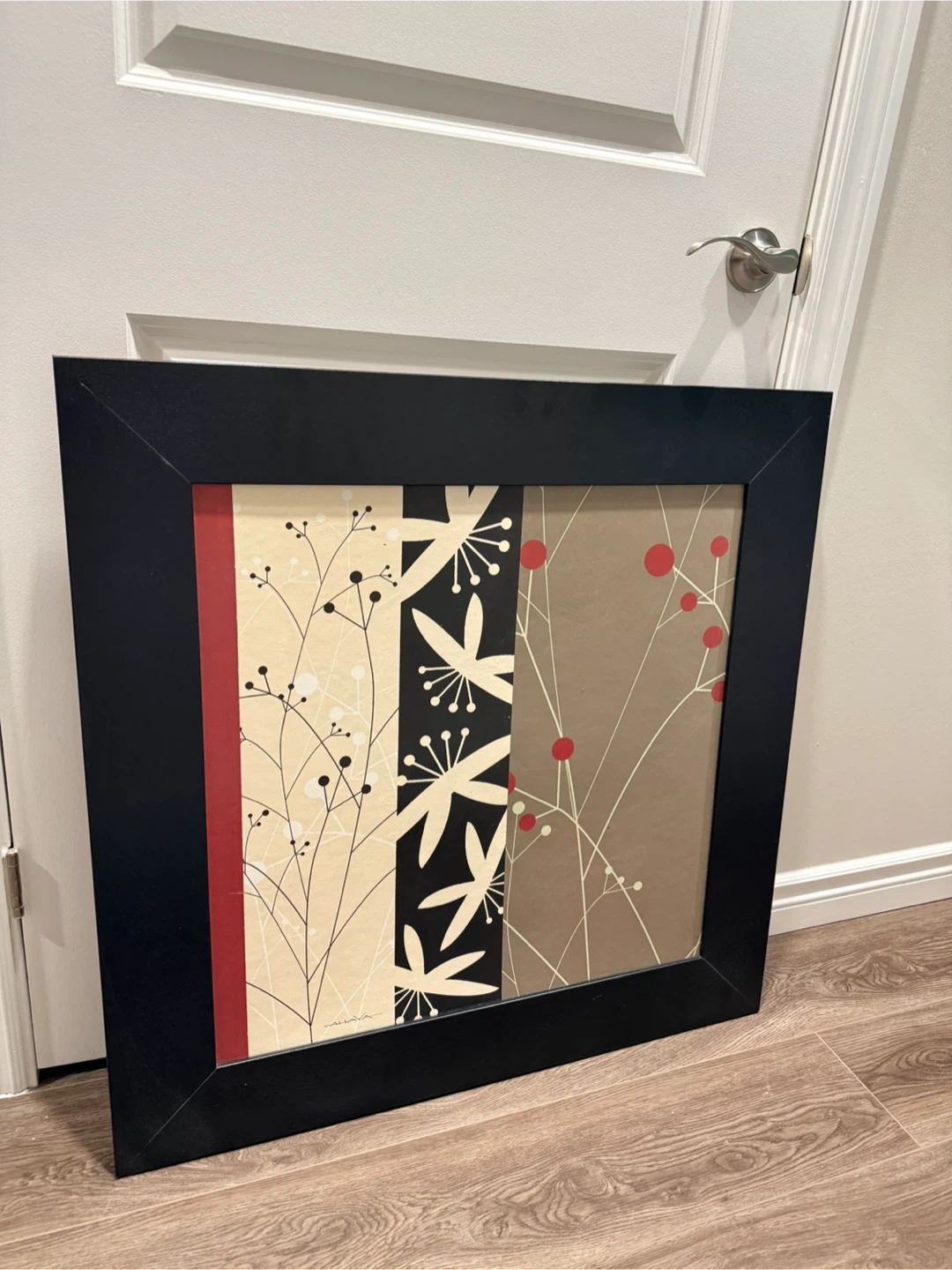 This framed wall art features a modern botanical design with a black frame. It measures approximately 31.5 inches height and width. See pictures of measurement. The artwork includes a mix of black, white, beige, and red tones, adding a stylish touch to any room. It's ready to hang and enhance your decor!