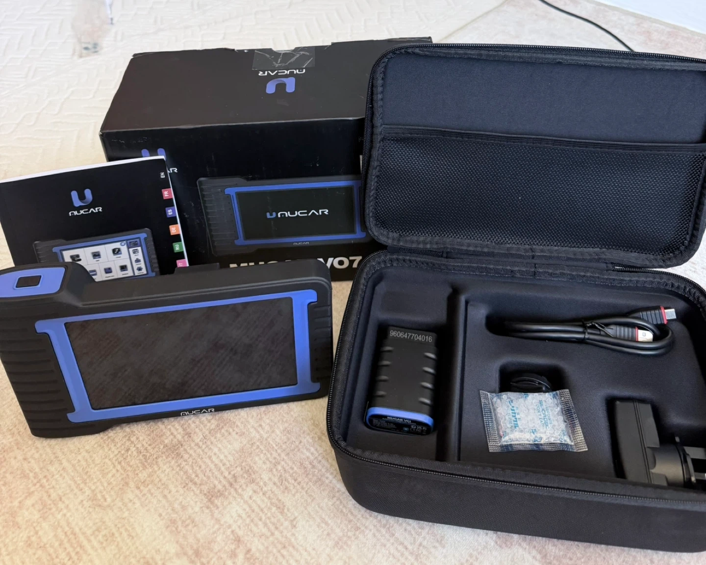 MUCAR VO7 automotive diagnostic tool for full system OBD2 scanning. It supports bidirectional control, ECU coding, and 28+ reset services. Includes a carrying case and accessories for lifetime free updates.