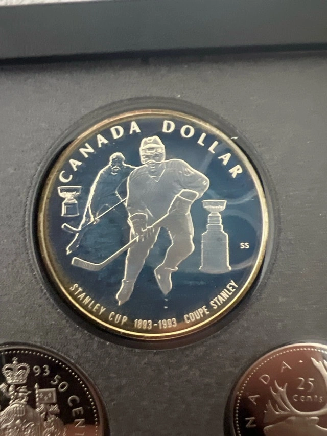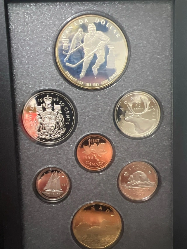 Offering a beautiful .925 sterling silver dollar proof set. This set features a Stanley Cup commemorative dollar, along with other Canadian denominations from 1 cent to 1 dollar. Only the silver dollar is sterling; the other coins' materials are listed on the paper. Includes all denominations from 1 cent to the loonie. Condition: Used - Good. For Sale By: Owner.