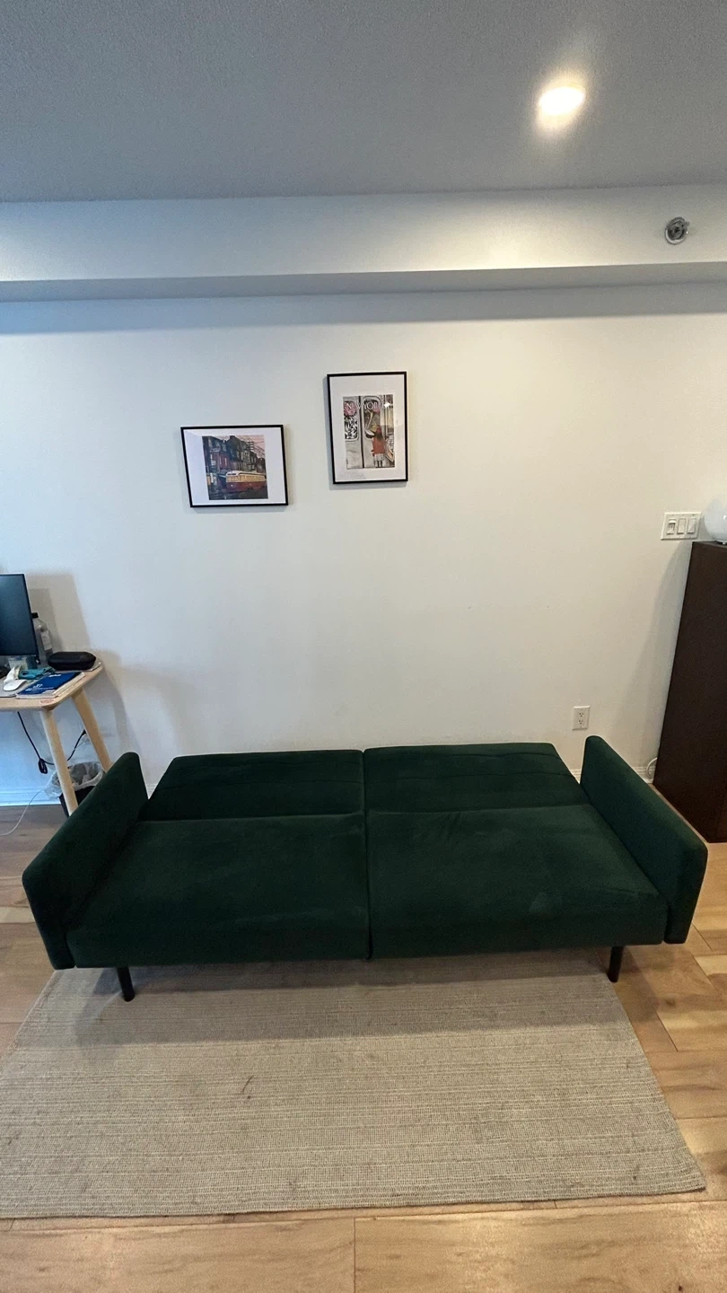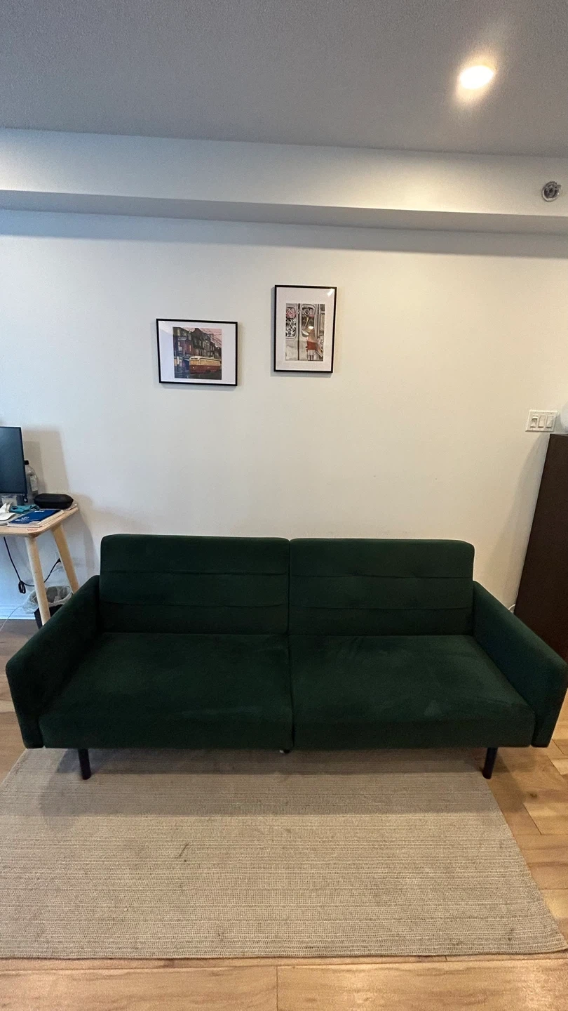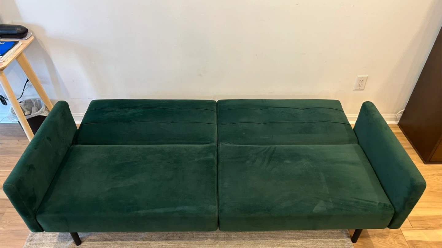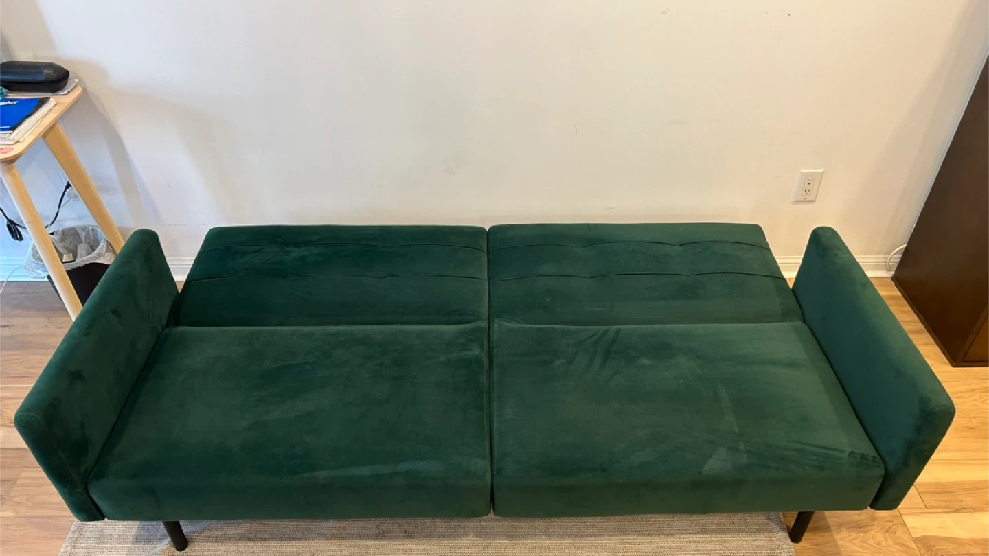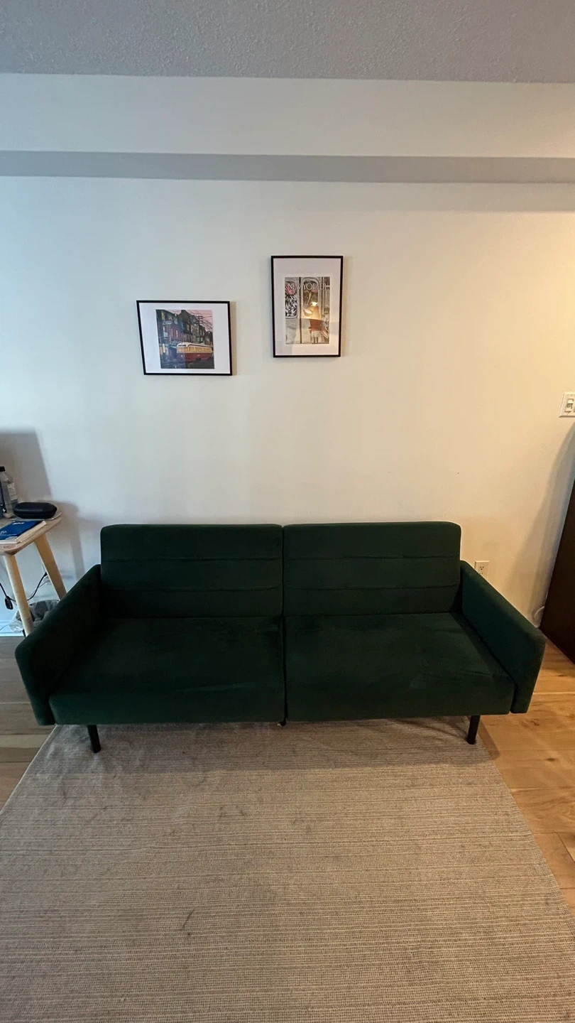 This green velvet futon sofa bed offers a stylish and functional seating solution. It's upholstered in soft velvet fabric and features a tufted design for added detail. The sofa easily converts into a bed, making it perfect for small spaces or guest rooms!