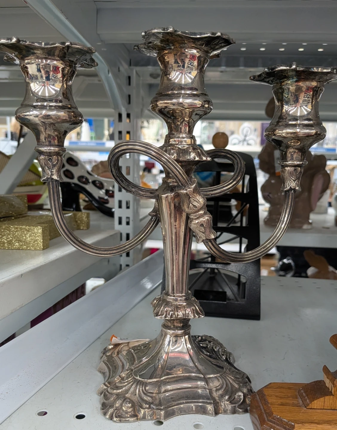 A decorative three-arm silver candlestick holder. It's made of metal with an ornate, scrolled base. This piece adds a touch of elegance to any table setting.