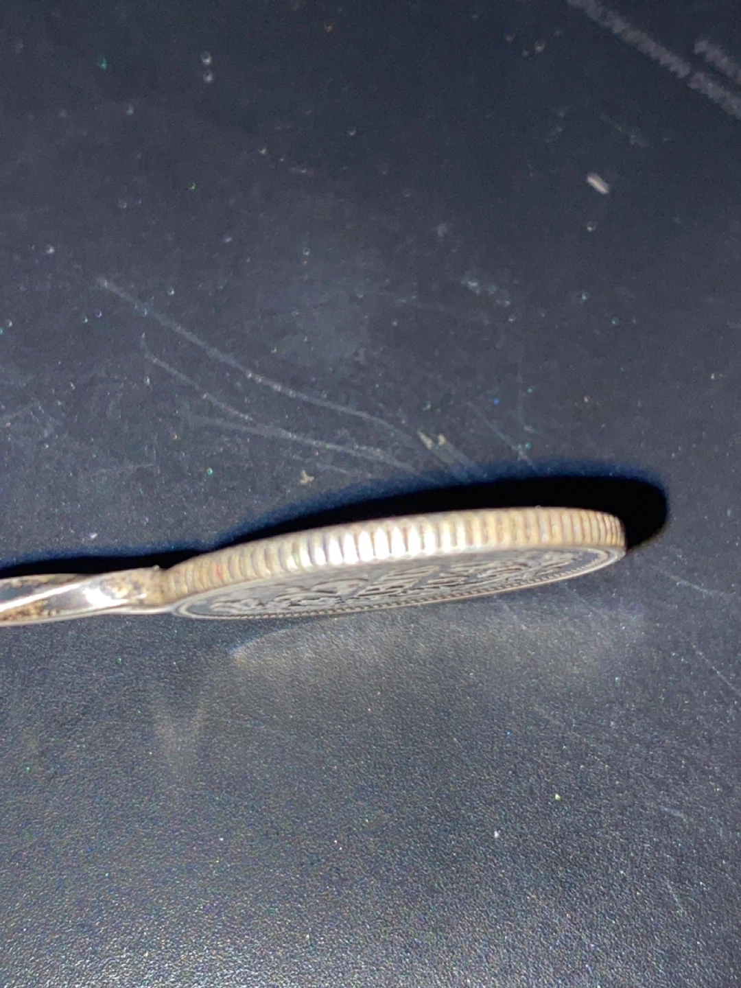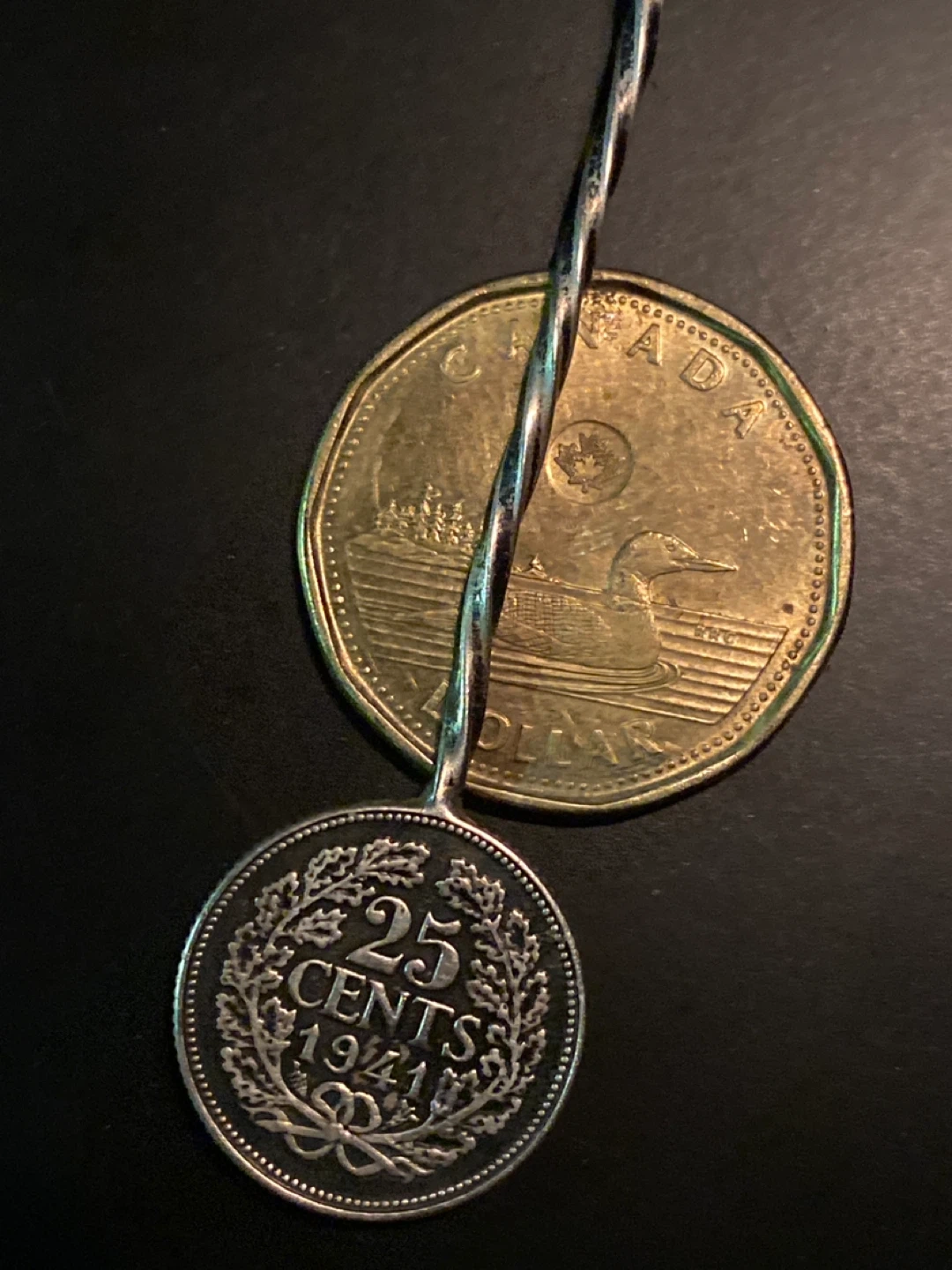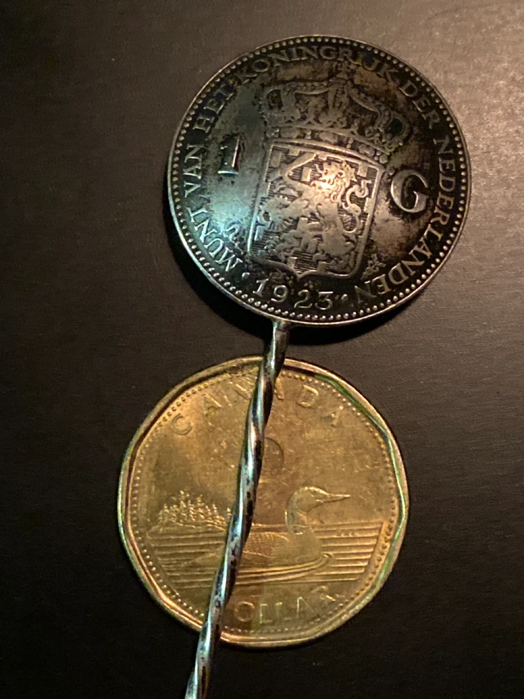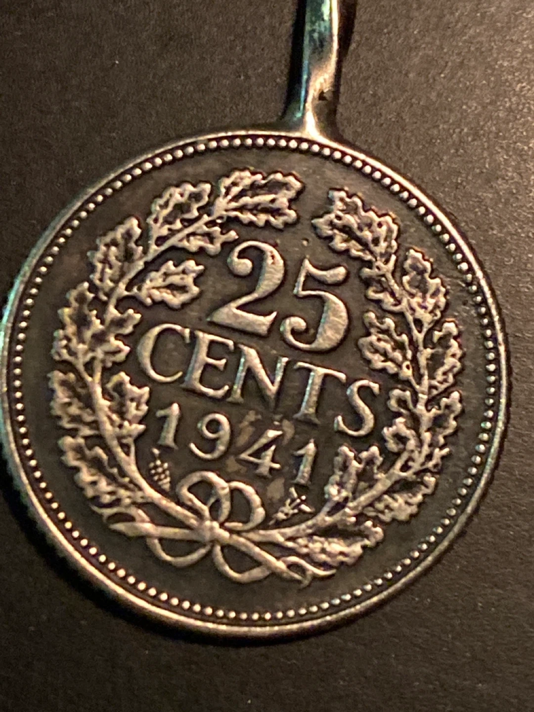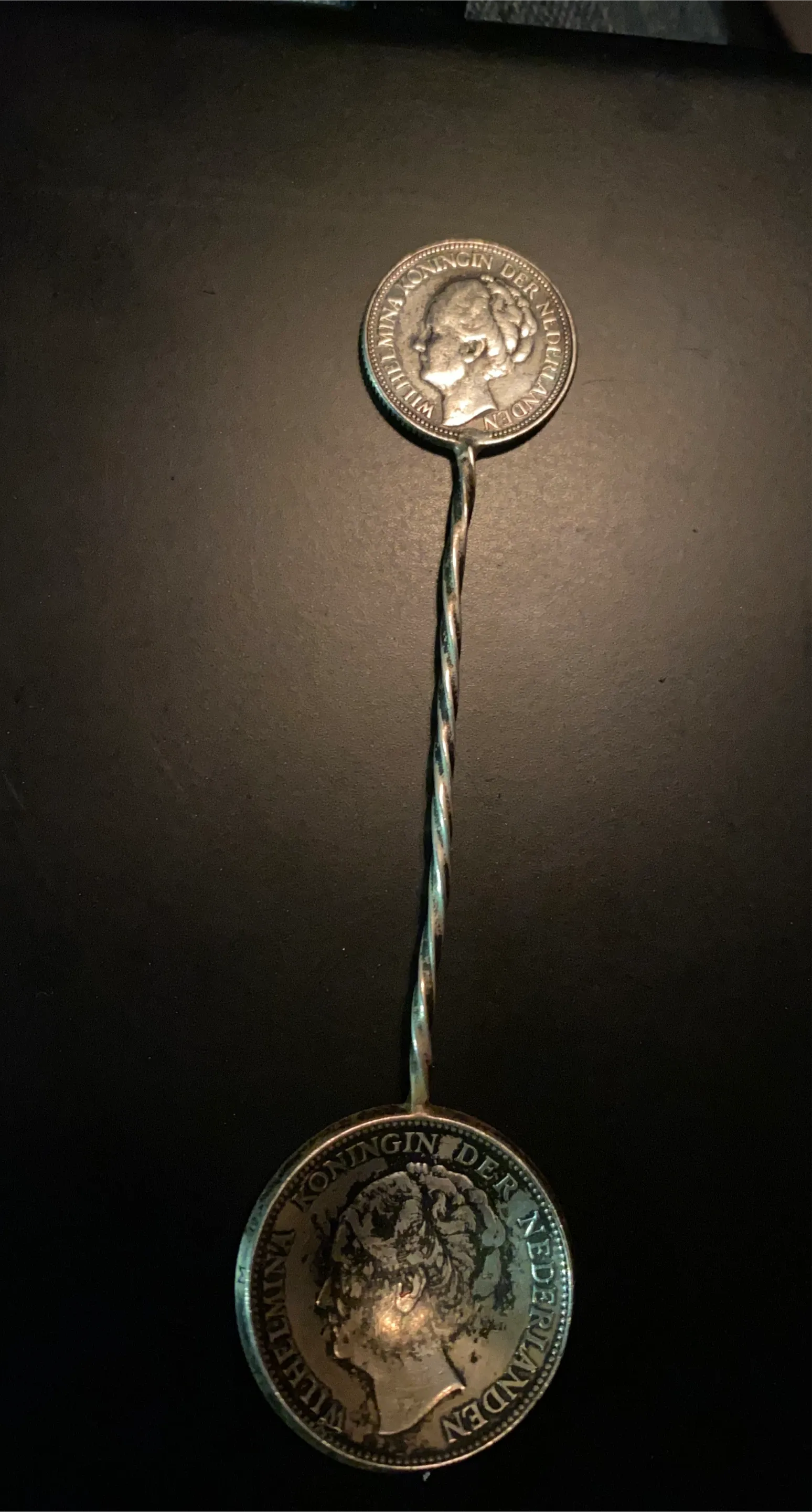 This is a decorative spoon featuring a vintage silver Dutch coin. The coin depicts Wilhelmina, Queen of the Netherlands. The spoon's handle has a twisted design. It's a unique collectible piece.