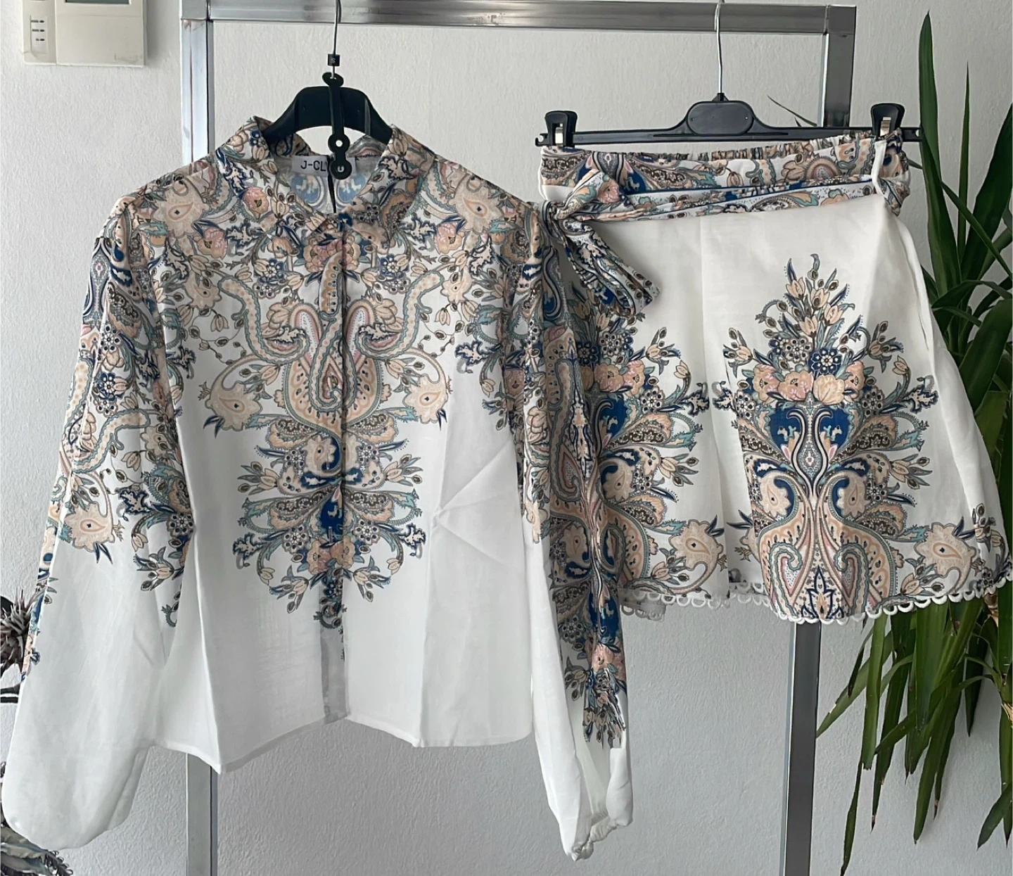 This J-CL set features a white blouse and skirt with a bold paisley print. The blouse has a collared neckline and long sleeves. The skirt has a tie waist detail. It's a stylish matching outfit!
