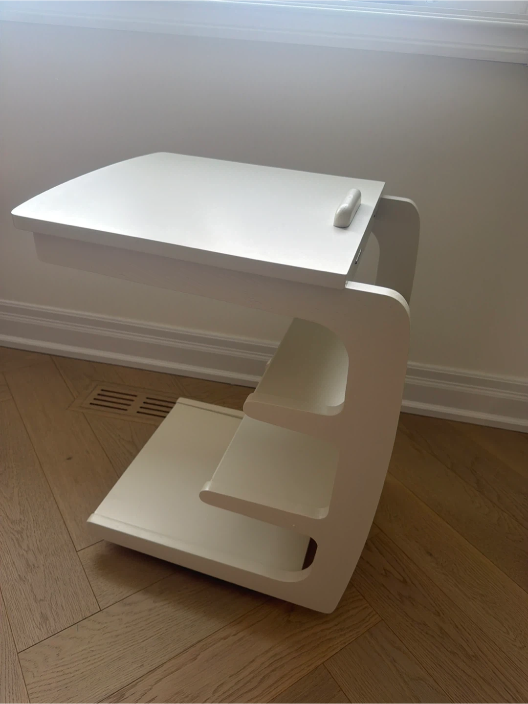 This is a versatile white easel and desk designed for toddlers. It has a tilting surface for drawing and writing. There are two shelves below for storing art supplies or books. It's a great piece for encouraging creativity!