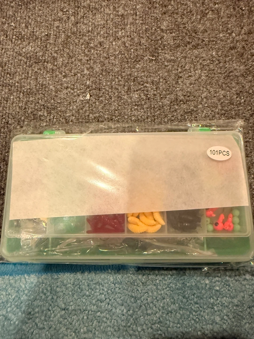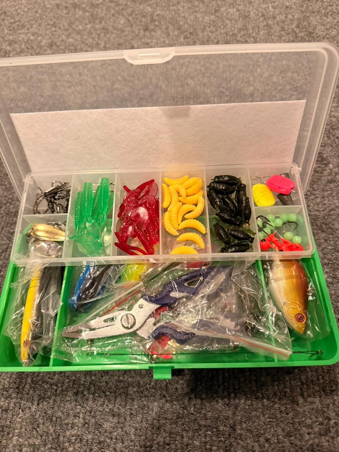 This fishing tackle box includes a variety of lures, hooks, and a pair of fishing pliers. It's a 101-piece set, perfect for a day out on the water. You'll find soft plastic baits, hard lures, and essential fishing accessories inside.