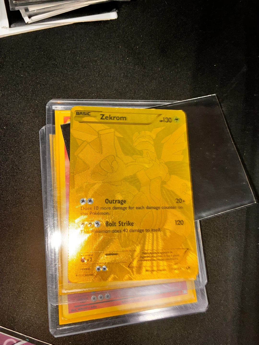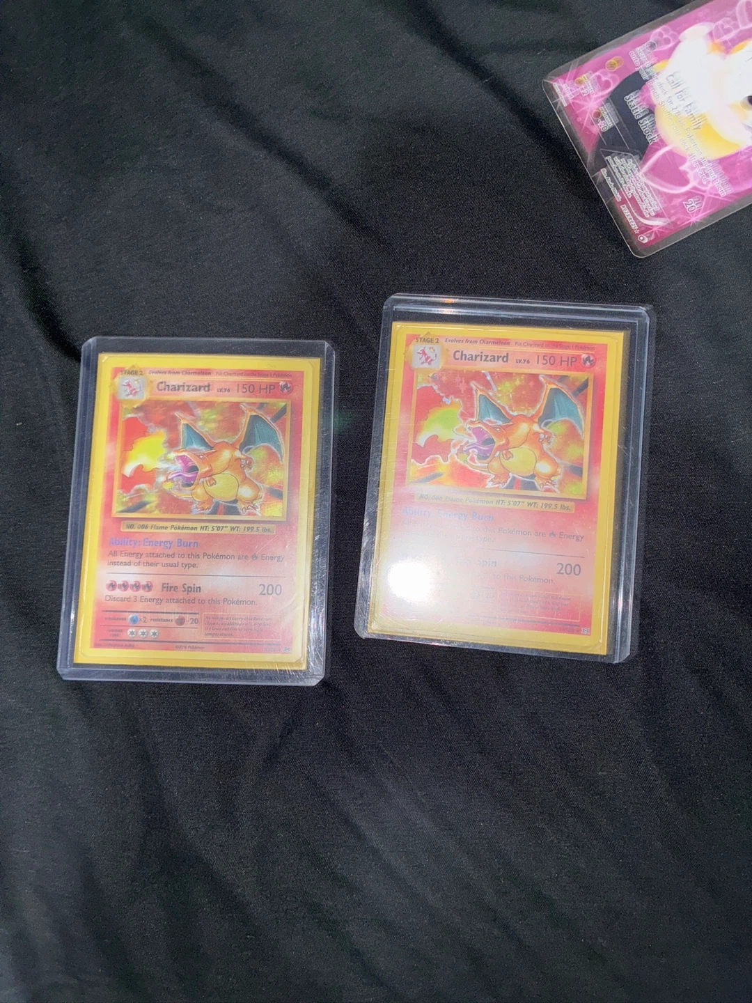 Two Charizard Pokemon trading cards are included. Additional Pokemon cards are also visible in the images. These cards are protected in plastic sleeves.