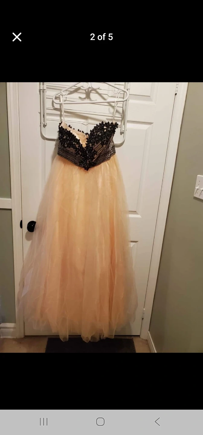 Gorgeous Envious Couture prom dress with a strapless black lace bodice and a flowing peachy-pink tulle skirt. This dress is a size 14 and perfect for any formal occasion. It's made with 100% polyester for a comfortable fit.