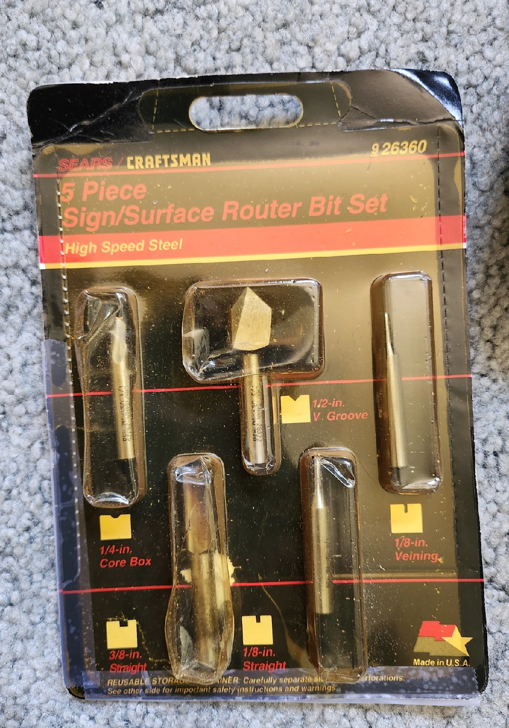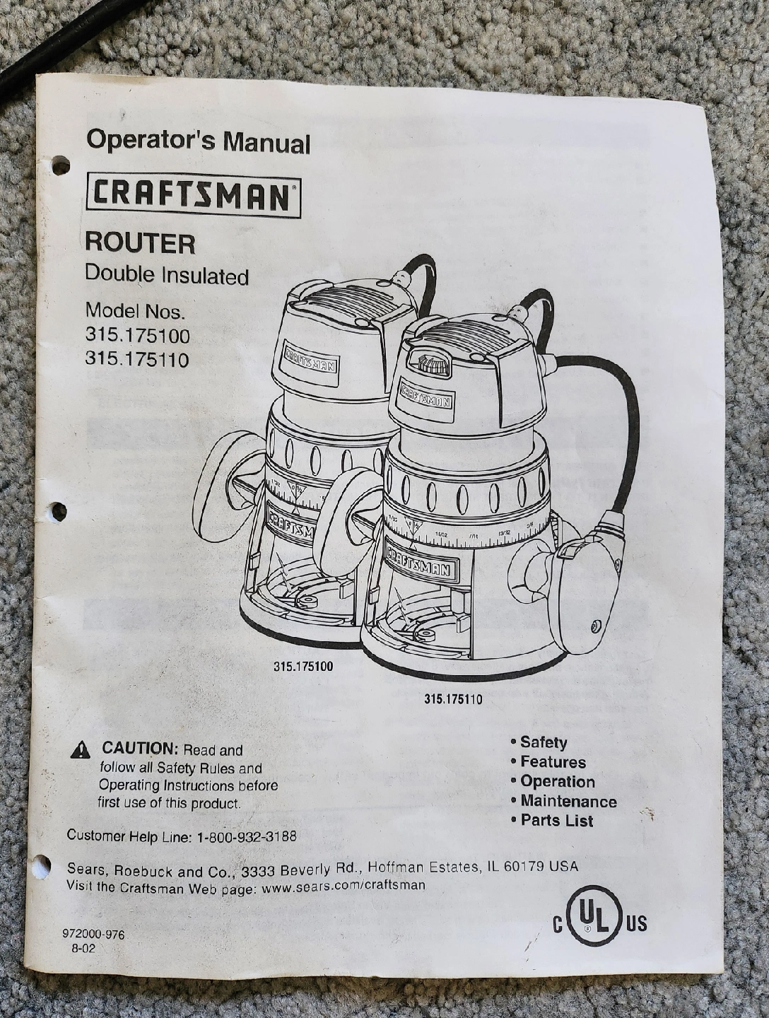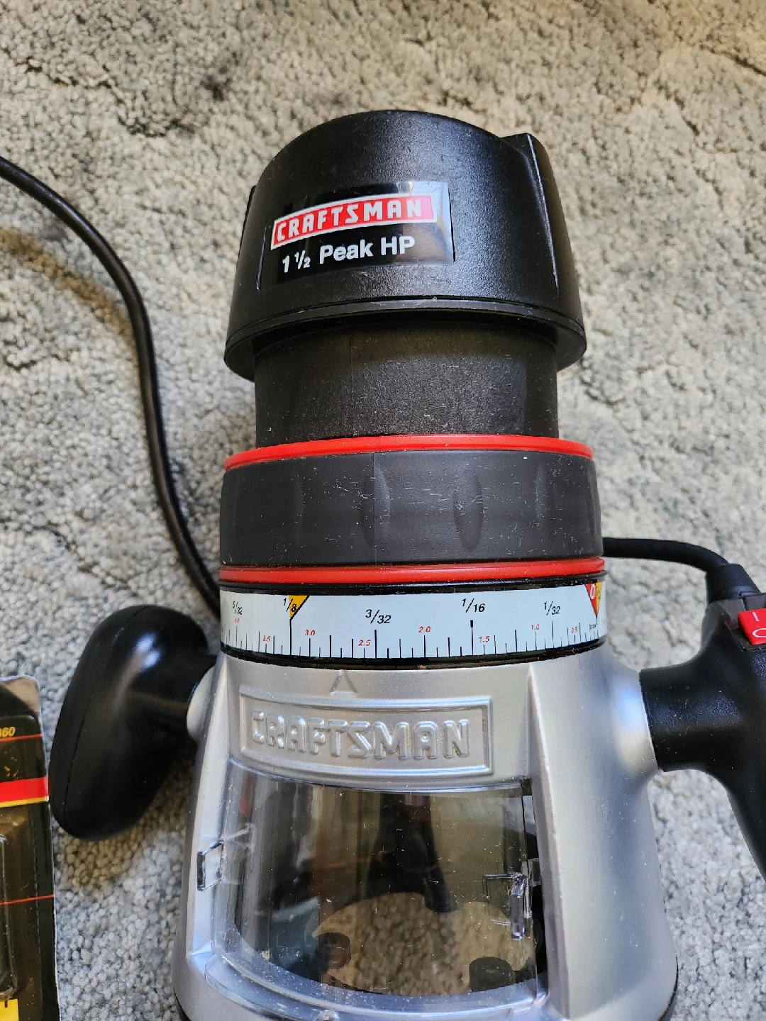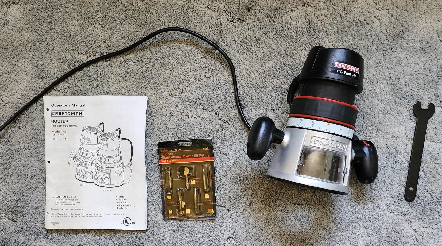 Selling a Craftsman router with 1 1/2 Peak HP. It comes with a 5-piece sign/surface router bit set made of high-speed steel. Also included is the operator's manual and a wrench, also carrying bag.